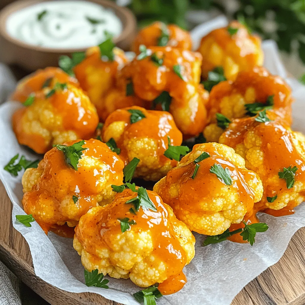 You can switch up the flavor of your buffalo cauliflower bites easily. Instead of buffalo sauce, try using BBQ sauce for a sweet twist. A spicy garlic sauce adds a nice kick too. You can also mix sauces for a unique taste. For a creamy option, toss the bites in ranch dressing after cooking. This adds a cool contrast to the heat of the sauce.