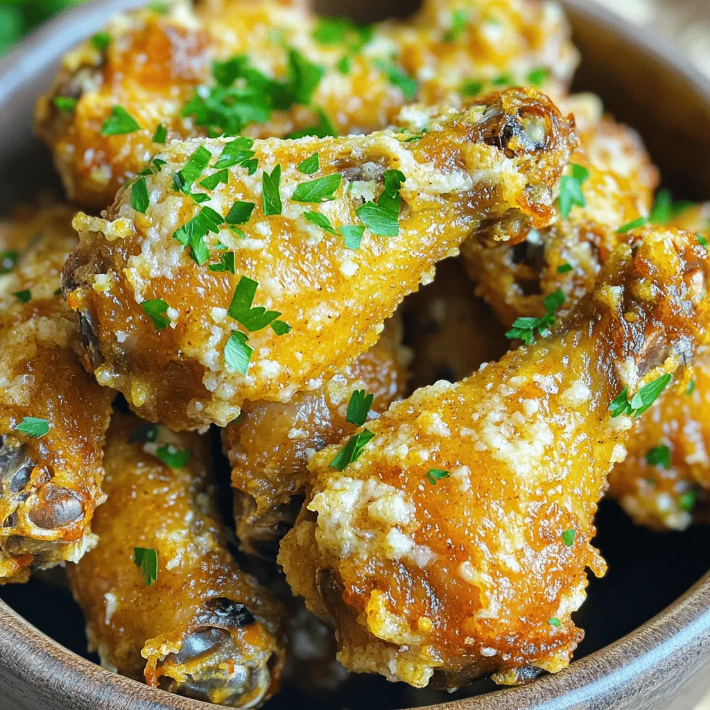 ![- 2 pounds chicken wings - 2 tablespoons olive oil - ½ cup grated Parmesan cheese - 1 teaspoon garlic powder - 1 teaspoon onion powder - 1 teaspoon smoked paprika - Salt and pepper to taste - 2 tablespoons fresh parsley, chopped - 2 tablespoons butter, melted Gathering the right ingredients is key for success in this recipe. First, you need chicken wings. I prefer fresh wings, but frozen can work too. You will also need olive oil, which helps with crispiness. Parmesan cheese adds a rich flavor. Next, for the seasoning, garlic powder and onion powder bring depth. Smoked paprika adds a nice touch. Don't forget salt and pepper to make it all pop. Finally, fresh parsley gives a bright finish. Melted butter helps to mix everything together. You can find the full recipe [Full Recipe] for more details on how to bring these flavors together. First, preheat your air fryer to 400°F (200°C). This step takes about 5 minutes. While the air fryer heats, grab a large mixing bowl. Add the chicken wings, olive oil, garlic powder, onion powder, smoked paprika, salt, and pepper. Mix these ingredients well. You want to coat every wing evenly. This blend makes the wings tasty and helps them crisp up nicely. Next, place the seasoned wings in the air fryer basket. Make sure they are in a single layer. This helps them cook evenly. If you have many wings, you might need to do this in batches. Air fry the wings for 25 to 30 minutes. Flip them halfway through cooking. This flip is key for even crispiness. You want them golden brown and crunchy. While the wings cook, it's time to mix the garlic Parmesan sauce. In a separate bowl, combine the melted butter, grated Parmesan cheese, and chopped parsley. Once the wings are done, transfer them to the bowl with your sauce. Toss them well to coat each wing. This step adds a rich flavor that makes the wings irresistible. Serve them right away and enjoy! For the full recipe, check out the earlier section. To get the best crispiness, cook the wings in a single layer. This allows hot air to circulate evenly. If you stack them, they won't cook right. You may need to do this in batches. If they aren't crispy enough, add a few more minutes to the cooking time. Just watch them closely to avoid burning. Feel free to change the seasonings to fit your taste. You can add cayenne for heat or lemon zest for brightness. For dipping sauces, try ranch or blue cheese. These pair well with garlic Parmesan flavors and enhance the dish. For a great look, serve the wings with fresh veggies like carrots and celery. This adds color and crunch. Use a large platter or a rustic wooden board to show off your wings. It makes them look extra tasty and inviting. For the full recipe, check out the detailed instructions and enjoy these delicious wings! {{image_2}} You can spice up your wings in many ways. For a kick, try spicy garlic Parmesan wings. Just add cayenne pepper or hot sauce to the mix. This will give your wings a nice heat without losing their garlic and cheese charm. If you want a fresh twist, consider herb-infused options. Mix in dried basil or oregano to the garlic Parmesan sauce. This adds depth and a garden flavor to every bite. While air frying is great, you can also bake your wings in the oven. Preheat your oven to 425°F (220°C). Spread the wings on a baking sheet. Bake for about 40-45 minutes until crispy. Grilling is another fun option, especially in summer. Toss your seasoned wings on the grill for a smoky taste. Just be sure to keep an eye on them, so they don’t burn. If you need gluten-free wings, use gluten-free soy sauce instead of regular. This keeps the flavor while making them safe for those with gluten issues. For a lower-fat adaptation, you can skip the butter in the garlic Parmesan sauce. Use a light olive oil spray instead. This reduces calories but keeps your wings tasty. Try these variations to match your needs and preferences! For the full recipe, check out the detailed instructions above. To keep your leftover wings fresh, store them in the fridge. Place the wings in a shallow container. Make sure to cover it tightly with a lid or plastic wrap. This helps keep the wings from drying out. They can last for up to three days in the fridge. For best results, try to eat them within two days. The best containers for storage are glass or BPA-free plastic. These materials do not absorb odors. They also help maintain flavor and texture. When you want to enjoy your wings again, reheating them is easy. The best method is to use the air fryer again. Preheat your air fryer to 350°F (175°C). Place the wings in a single layer. Heat them for about 5 to 7 minutes. This keeps them crispy. To avoid sogginess, do not use the microwave. Microwaves make wings soft and chewy. If you must use a microwave, place a paper towel under the wings. This helps absorb moisture. You can freeze both uncooked and cooked wings. For uncooked wings, season them and place them in a freezer bag. Remove all air from the bag. This keeps them fresh for up to six months. For cooked wings, allow them to cool completely before freezing. Place them in an airtight container. They can last for up to three months in the freezer. When you are ready to cook frozen wings, thaw them in the fridge overnight. This way, they stay safe and are ready to cook the next day. How long to air fry chicken wings? You should air fry chicken wings for about 25 to 30 minutes. Flip them halfway through to ensure even cooking. This gives them that crispy texture we all love. Can I use frozen wings for this recipe? Yes, you can use frozen wings. Just add a few extra minutes to the cooking time. Make sure they are not stuck together when you place them in the air fryer. Are air fryer wings healthier? Air fryer wings are generally healthier than deep-fried wings. You use less oil, which cuts down on calories and fat. This way, you can enjoy crispy wings without the guilt. Comparison with deep-fried wings Deep-fried wings soak up a 