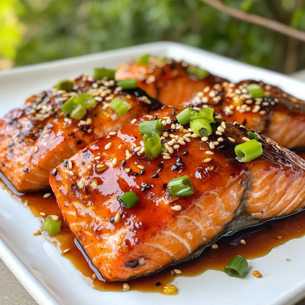 Serve the salmon garnished with sliced green onions and a sprinkle of sesame seeds.