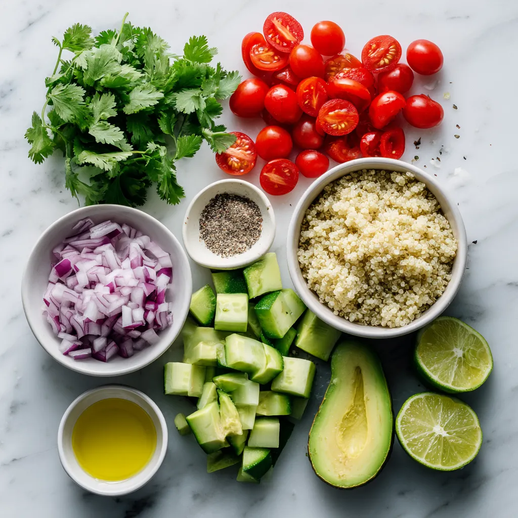 In a large mixing bowl, combine the cooked quinoa, diced avocado, cherry tomatoes, cucumber, red onion, and cilantro.