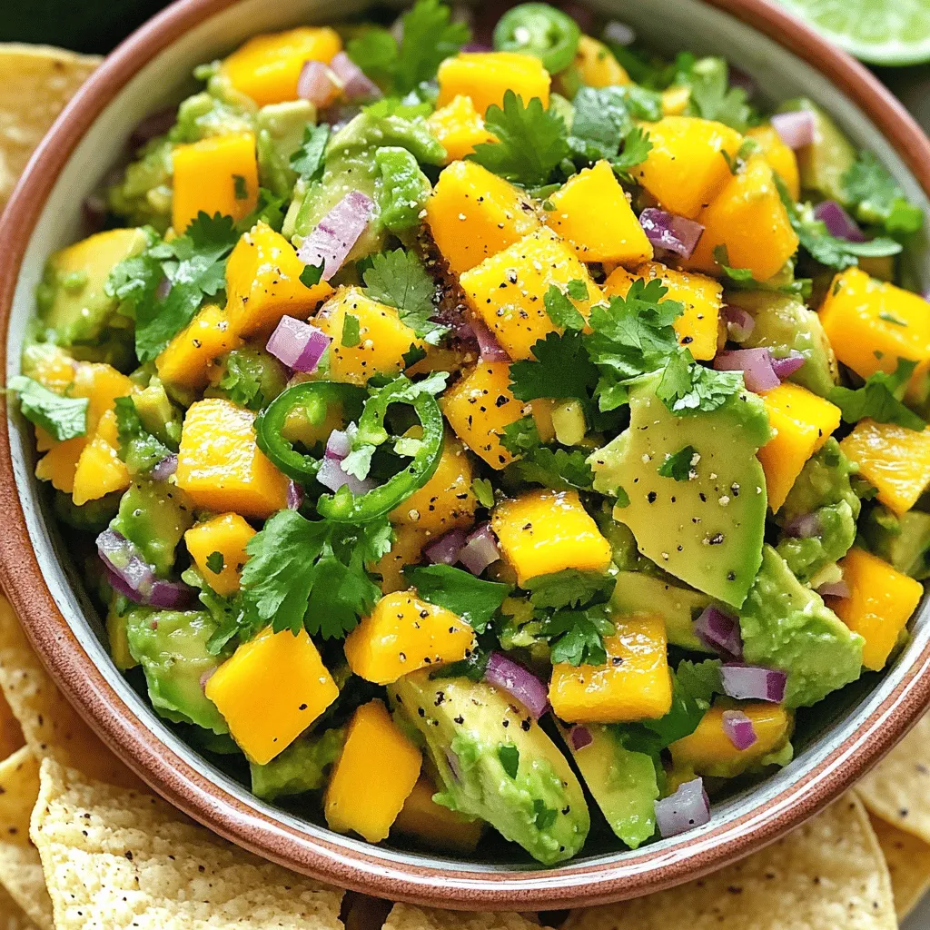 To make a great avocado mango salsa, you need: - 2 ripe avocados, diced - 1 ripe mango, diced - 1 small red onion, finely chopped - 1 jalapeño, deseeded and minced - 1/4 cup fresh cilantro, chopped - Juice of 2 limes - Salt and pepper to taste - 1 teaspoon cumin (optional for extra warmth) These ingredients create a fresh, vibrant flavor. Each one adds something special. You can change the recipe to fit your taste. Here are some ideas: - Add diced bell peppers for crunch. - Swap lime juice with lemon juice for a new twist. - Mix in diced tomatoes for extra color. - Use garlic for a bold flavor. - Try different herbs like mint or parsley. These options let you explore and make it your own. Each serving of avocado mango salsa is not only tasty but healthy too. Here’s what you get per serving: - Calories: 150 - Total fat: 10g - Saturated fat: 1.5g - Carbohydrates: 15g - Fiber: 6g - Protein: 2g This salsa is full of nutrients, and it’s a great snack or side dish. Check out the Full Recipe for more details! To make this salsa, start by gathering your ingredients. You need ripe avocados, a ripe mango, red onion, jalapeño, cilantro, lime juice, salt, and pepper. Here’s how to prepare it: 1. Dice the ripe avocados and mango. 2. Finely chop the red onion. 3. Deseed and mince the jalapeño. 4. In a medium mixing bowl, combine the diced avocados and mango. 5. Add the chopped red onion and minced jalapeño. 6. Gently mix in the chopped cilantro and lime juice. 7. Season with salt, pepper, and cumin if you like. 8. Stir gently until everything is well combined. 9. Taste and adjust the seasoning as needed. This entire process takes just ten minutes. You can find the full recipe for more details. When you mix your salsa, do it gently. You want to keep the avocado chunks intact. This way, each bite has a nice texture. If you mix too hard, you might end up with guacamole instead. Also, taste your salsa as you go. Adjust the lime juice, salt, or pepper to fit your taste. Everyone likes it a bit different! Serve this salsa in a bright bowl for a pop of color. You can top it with extra cilantro for a beautiful finish. It pairs well with tortilla chips for a snack or appetizer. You can also use it as a topping for grilled fish or chicken. The fresh flavors brighten up any meal. Enjoy this fresh salsa at your next gathering! To make great avocado mango salsa, you need ripe fruits. Look for avocados that feel slightly soft when you press them. They should not feel mushy. For mangos, choose ones with a slight give when you squeeze. Their color may vary, but a sweet smell is a good sign. If you have extra salsa, store it in an airtight container. This keeps it fresh. Place a piece of plastic wrap directly on the surface of the salsa. This helps prevent browning. Use the salsa within two days for the best taste. You can boost the flavor of your salsa easily. Try adding chopped garlic for a punch. A dash of chili powder adds warmth without heat. Fresh herbs like mint or basil give a unique twist. Experiment with these ideas to find your favorite mix. For the full recipe, check out the Tropical Avocado Mango Salsa. {{image_2}} You can change the taste of avocado mango salsa easily. Try adding diced pineapple for extra sweetness. If you like heat, toss in more jalapeño or a dash of hot sauce. For a twist, mix in black beans or corn. These add-ins give your salsa a fresh flavor. This salsa is super versatile. You can enjoy it with tortilla chips for a snack. It also pairs great with grilled chicken or fish. Use it as a topping for tacos or quesadillas. For a light meal, serve it over a bed of greens. Avocado mango salsa is already vegan and gluten-free. It works for many diets. If you want to add protein, consider mixing in chickpeas. Always check labels when using packaged ingredients. This way, you ensure everything stays true to your dietary needs. For the full recipe, check out the Tropical Avocado Mango Salsa section. To keep your avocado mango salsa fresh, store it in an airtight container. Make sure the lid seals tightly. If you're worried about browning, press plastic wrap directly onto the salsa before sealing. This reduces air exposure and keeps it vibrant. When stored correctly, avocado mango salsa lasts about 1 to 2 days in the fridge. After that, the avocados may turn brown, and the flavors can fade. Always check for signs of spoilage before using. If it looks or smells off, it’s best to discard it. Freezing salsa can change the texture. However, if you want to save it longer, it can last up to 3 months in the freezer. Use freezer-safe bags or containers. Leave some space for expansion as it freezes. Thaw it in the fridge overnight before using. Enjoy your tropical avocado mango salsa whenever you like with these storage tips! You can find the full recipe for making this delightful dish above. You can serve Avocado Mango Salsa with many tasty options. It pairs well with tortilla chips. You can also use it as a topping on grilled fish or chicken. This salsa adds a fresh taste to tacos and burritos. For a light meal, try it on a salad. The mix of avocado and mango adds a sweet touch. Yes, you can make this salsa ahead of time. I recommend preparing it a few hours before serving. This allows the flavors to blend well. However, avoid making it too far in advance. Freshness is key to keeping the taste bright and vibrant. To keep avocados from browning, use lime juice. The acid in lime juice slows down the browning process. You can also store the salsa in an airtight container. Press plastic wrap directly onto the surface of the salsa. This helps limit air exposure. If you have leftovers, enjoy them within a day for the best taste. Avocado mango salsa combines fresh ingredients for a tasty twist. We've covered how to choose ripe fruits, tips for preparing your salsa, and creative variations. Proper storage keeps the salsa fresh for longer, and I've shared answers to common questions. Think about how