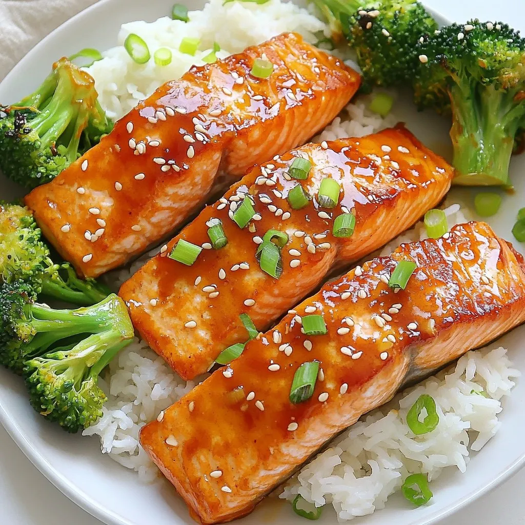 A delicious baked salmon dish marinated in teriyaki sauce, served with jasmine rice and steamed broccoli.
