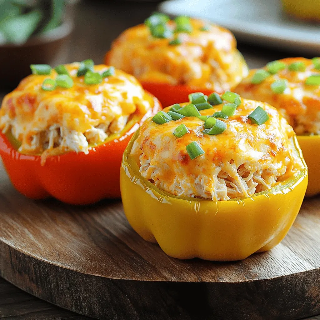 To make your stuffed peppers shine, start with fresh bell peppers. Choose ones that feel firm and have no soft spots. Cut the tops off carefully and remove all seeds. This helps the filling mix blend well. When mixing the filling, use shredded chicken for easy bites. Cream cheese adds a rich taste. For a kick, adjust the buffalo sauce to your liking. Want extra flavor? Add more green onions or garlic powder.