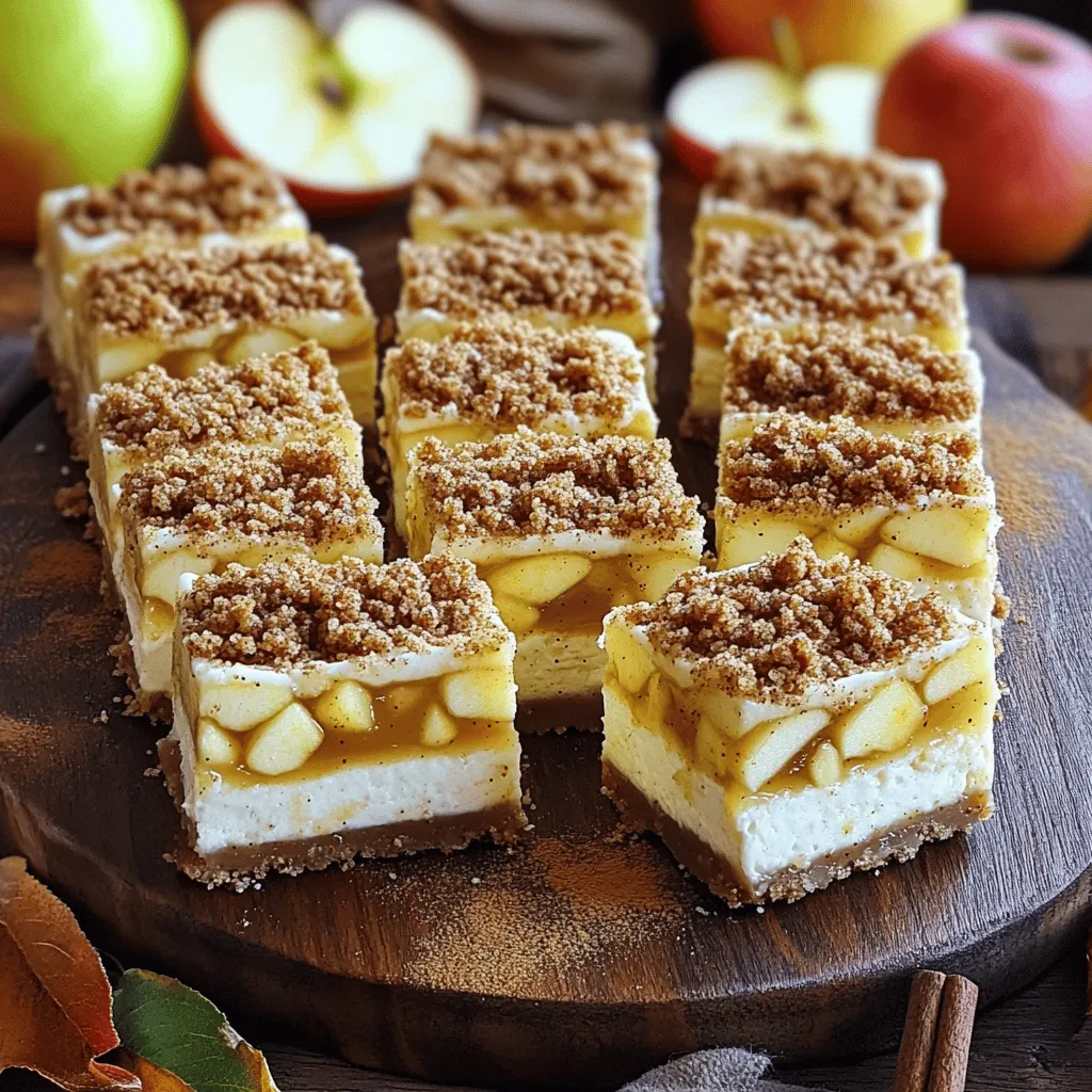 To make the caramel apple crisp cheesecake bars, gather these ingredients: - 1 cup graham cracker crumbs - 1/4 cup unsalted butter, melted - 2 cups cream cheese, softened - 1 cup granulated sugar - 1 teaspoon vanilla extract - 3 large eggs - 2 cups apples, peeled and diced (about 2 medium apples) - 1 teaspoon cinnamon - 1/2 teaspoon nutmeg - 1 cup brown sugar - 1/2 cup old-fashioned oats - 1/4 cup all-purpose flour - 1/4 teaspoon salt - 1/4 cup caramel sauce (store-bought or homemade) I suggest using high-quality cream cheese for the best flavor. Brands like Philadelphia give great results. For butter, unsalted works best so you can control the salt in your dessert. If you want to make this recipe dairy-free, use vegan cream cheese and coconut butter. For gluten-free bars, swap graham cracker crumbs with gluten-free crumbs. If you prefer fresh apples, I recommend Granny Smith for their tartness. You can also use canned apples if you are short on time. Just be sure to drain them well. For a healthier version, consider using honey or maple syrup instead of granulated sugar. This adds a unique flavor and cuts refined sugar. 1. Preheat your oven to 350°F (175°C). This helps the cheesecake bake evenly. 2. Grease a 9x13 inch baking dish. Line it with parchment paper. Leave some paper hanging over the edges. This makes it easy to lift the bars out later. 3. In a medium bowl, mix graham cracker crumbs and melted butter. Press this mixture firmly into the bottom of your baking dish. This is your crust. 4. Bake the crust for 8-10 minutes until it looks light golden. Then, remove it from the oven and let it cool a bit. 5. In another bowl, beat cream cheese and granulated sugar until smooth. This will be your cheesecake base. 6. Add vanilla extract and mix well. This adds flavor to your cheesecake. 7. Beat in eggs one at a time. Mix on low speed after each egg. This helps keep the batter smooth. 8. In a separate bowl, mix diced apples with cinnamon and nutmeg. These spices give the apples a warm taste. 9. Fold the apple mixture into the cream cheese mix. Do this carefully so you don't lose any air. 10. Pour the cheesecake filling over the cooled crust. Spread it evenly with a spatula. 11. In a new bowl, combine brown sugar, oats, flour, and salt. Add melted butter and mix it until crumbly. This is your topping. 12. Sprinkle the topping over the cheesecake layer. Make sure it covers it well. 13. Bake the bars for 40-45 minutes. The edges should be set, and the center should jiggle a bit. 14. Remove from the oven and let them cool completely in the pan. 15. Drizzle with caramel sauce before serving. This adds a sweet finish. 16. Use the parchment paper to lift the bars out of the pan. Cut them into squares for serving. To get a smooth cream cheese mixture, beat the cream cheese well. Make sure it is soft before mixing. If it’s too cold, it will not mix well. Add the sugar slowly. This ensures it blends in smoothly. When you fold in the apples, be gentle. Use a spatula and lift the mixture. This helps keep air in it, making the bars fluffy. For a beautiful presentation, arrange the bars on a nice platter. Drizzle extra caramel sauce on top for a sweet look. You can add sliced apples around the bars. A sprinkle of cinnamon gives a nice touch. Cut the bars into 12 squares. Each piece is a perfect size for a treat. You can also serve them with whipped cream or vanilla ice cream on the side. This makes each bite even more special! To get the best cheesecake texture, always start with softened cream cheese. Cold cream cheese can cause lumps. Mix the cream cheese and sugar slowly. Overmixing can add too much air and lead to cracks. When you fold in the apples, be gentle. You don’t want to break the apples down too much. Common mistakes include not cooling the crust enough before adding the filling and overbaking the bars. The center should be slightly jiggly when you take it out. This ensures a smooth, creamy finish. To save time, you can prepare the crust a day in advance. Just store it in the fridge. You can also chop the apples ahead of time. Keep them in lemon water to prevent browning. If you're short on time, using store-bought graham cracker crumbs can speed things up. Buying pre-made caramel sauce cuts down on prep time, too. Homemade can be fun but takes longer to make. Want to boost the flavor? Add more spices! Try a pinch of ginger or cloves for a warm twist. For a nutty flavor, mix in chopped walnuts or pecans. This adds crunch and richness to the bars. You can also drizzle melted chocolate over the top for extra sweetness. A sprinkle of sea salt can enhance the caramel flavor beautifully. Don't be afraid to experiment with flavors! {{image_2}} You can switch up the fruit in this recipe. Try pears or peaches for a fresh twist. Both fruits add unique flavors that work well with the creamy cheesecake. For winter, add spices like ginger or cloves to warm the taste. These spices bring a cozy feel, perfect for holiday gatherings. You can make this recipe fit your diet. For a low-sugar version, use sugar substitutes like erythritol or monk fruit. If you're looking for a keto-friendly option, swap out the graham cracker crust for almond flour. You can also make a vegan version. Use cashew cream instead of cream cheese and flax eggs in place of regular eggs. Serving ideas can be fun! Try layering the cheesecake filling in jars for a cute parfait. This way, guests can enjoy individual servings. You can also drizzle chocolate sauce or berry compote on top. These toppings add color and flavor, making each bite special. To keep your caramel apple crisp cheesecake bars fresh, store them in the fridge. Place the bars in an airtight container or cover them tightly with plastic wrap. This helps avoid drying out and keeps the flavors strong. Enjoy them within five days for the best taste and texture. If you want to save some bars for later, freezing is a great option. First, let the bars cool completely. Th
