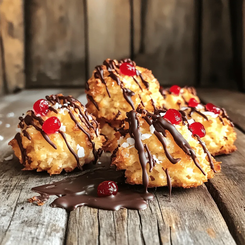 ![- 2 cups shredded unsweetened coconut - 1 cup sweetened condensed milk - 1/2 cup maraschino cherries, chopped These main ingredients create the base of your cherry coconut macaroons. The shredded coconut gives them a chewy texture. Sweetened condensed milk adds sweetness and binds everything together. Chopped maraschino cherries bring a burst of flavor and color. - 1/4 cup dark chocolate chips - Flavor extracts: vanilla and almond - A pinch of salt Optional ingredients can elevate your macaroons. Dark chocolate chips add a rich touch. Vanilla and almond extracts enhance the flavor profile. A pinch of salt balances the sweetness and brings out the other flavors. For the full recipe, follow the detailed instructions. Enjoy baking these tasty treats! 1. Preheat the oven and prepare baking sheets. Start by setting your oven to 325°F (160°C). This heat helps the macaroons turn golden. Line your baking sheet with parchment paper. This keeps the macaroons from sticking. 2. Mix the coconut and condensed milk. In a large bowl, combine 2 cups of shredded coconut with 1 cup of sweetened condensed milk. Add 1 teaspoon of vanilla extract, 1/4 teaspoon of almond extract, and a pinch of salt. Stir well until the coconut is coated. 1. Incorporate cherries and form mounds. Gently fold in 1/2 cup of chopped maraschino cherries. Be careful not to break them. Use a small cookie scoop or your hands to shape the mixture into small mounds, about 1 to 1.5 inches in size. 2. Placement on the baking sheet. Place the mounds on the lined sheet, leaving space between each one. This allows them to bake evenly and not stick together. 1. Bake until golden brown. Put the baking sheet in the oven. Bake for 18-20 minutes or until the edges turn golden brown. Keep an eye on them, so they don’t burn. 2. Cooling process on wire rack. Once baked, take them out and let them cool on the sheet for about 10 minutes. After that, transfer them to a wire rack to cool completely. This step makes them chewy and tasty. For the complete recipe, refer to the [Full Recipe]. Enjoy the fun of making these delicious cherry coconut macaroons! To get that perfect chew in your macaroons, focus on the coconut-to-liquid ratio. I recommend using 2 cups of shredded coconut to 1 cup of sweetened condensed milk. This balance keeps the macaroons moist but not too wet. If your mix feels too dry, add a bit more condensed milk. Even baking is key to a great texture. Make sure you space the mounds at least an inch apart on the baking sheet. This helps hot air reach all sides, giving you a nice golden color around the edges. Adding extra flavor can make a big difference. I love using a splash of vanilla or almond extract. Just a teaspoon can brighten the taste. For a special touch, try drizzling melted dark chocolate on top. It adds a rich contrast to the sweet cherries and coconut. Sometimes, your mix may be too wet or too dry. If it’s too wet, add a little more coconut. If it’s too dry, a dash of condensed milk can help. Shaping your macaroons evenly is important for even baking. Use a small cookie scoop for uniform size. If you’re using your hands, wet them slightly to prevent sticking. This way, you’ll get nice, round mounds that bake evenly. For the complete recipe, refer to the [Full Recipe]. {{image_2}} You can switch things up with flavor variations for your cherry coconut macaroons. Try a tropical twist by adding fresh pineapple. Just chop it finely and mix it in with the cherries. This adds a bright, fruity taste. Another fun option is to dip them in chocolate. Melt dark chocolate and drizzle it over the cooled macaroons. This adds a rich layer of flavor and makes them look fancy. If you need gluten-free options, you’re in luck! This recipe is already gluten-free since it uses coconut and sweetened condensed milk. For vegan alternatives, swap sweetened condensed milk with a coconut milk-based version. You can find this in many stores. Just check the label to ensure it’s dairy-free. When serving these macaroons, think about pairing them with beverages. A hot cup of coffee or a cold glass of almond milk works great. For parties, display them on a pretty platter. You can add colorful fruits around the macaroons for a nice touch. A simple garnish of mint leaves adds freshness and makes the plate pop. For the full recipe, check the details provided earlier. To keep your cherry coconut macaroons fresh at room temperature, use an airtight container. This helps keep them chewy and prevents them from drying out. You can stack them in the container, but place parchment paper between layers. This avoids sticking. Store them in a cool, dark place for up to five days. For long-term storage, freezing is the best option. Allow the macaroons to cool completely. Then, place them in a single layer on a baking sheet. Freeze them for about one hour. After that, transfer them to a freezer-safe bag or container. Make sure to remove as much air as possible. They can stay in the freezer for up to three months. When you want to enjoy them, thaw the macaroons in the fridge overnight. You can also let them sit at room temperature for a few hours. If you prefer them warm, reheat them in the oven at 300°F for about 5-10 minutes. This brings back their chewy texture. Enjoy your delicious treat anytime! For the Full Recipe, check the earlier section. Cherry coconut macaroons can last about a week at room temperature. To keep them fresh, store them in an airtight container. This helps prevent them from becoming dry. If you want them to last longer, you can freeze them. Just make sure to wrap them well. Yes, you can use fresh cherries! Just make sure to chop them small and remove the pits. Fresh cherries can add a nice tartness to the macaroons. However, they have more moisture than maraschino cherries, so reduce the sweetened condensed milk slightly. This keeps the texture just right. Macaroons and macarons are not the same. Macaroons are made with coconut an