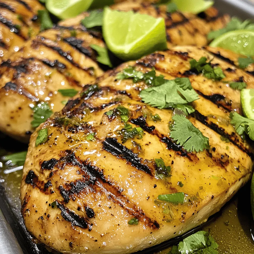 - 4 boneless, skinless chicken breasts - 3 tablespoons olive oil - Juice of 2 limes - Zest of 1 lime - 2 tablespoons chili powder - 1 teaspoon smoked paprika - 2 cloves garlic, minced - 1 teaspoon ground cumin - Salt and pepper to taste - Fresh cilantro, chopped, for garnish - Lime wedges, for serving When you pick your chicken, look for fresh, firm breasts with no discoloration. For the limes, choose ones that feel heavy for their size. This means they are juicy. If you're looking for swaps, you can use lime juice from a bottle, but fresh is best. If you want less spice, cut back on chili powder or use paprika only. For a different flavor, lemon juice works well too. This list from the Full Recipe will help you create a tasty dish that's juicy and flavorful! To make the marinade, start with a large bowl. Add 3 tablespoons of olive oil, the juice of 2 limes, and the zest of 1 lime. Next, mix in 2 tablespoons of chili powder, 1 teaspoon of smoked paprika, and 2 cloves of minced garlic. Don’t forget 1 teaspoon of ground cumin, plus salt and pepper to taste. This mix gives the chicken a bold flavor. Marinating the chicken is key. Let it soak in the marinade for at least 1 hour. If you can, leave it overnight. This extra time allows the flavors to really sink in and makes the chicken more tender. Before grilling, heat your grill to medium-high. While it heats up, take the chicken out of the marinade. Let any extra marinade drip off. Discard the leftover marinade to avoid any food safety issues. Place the chicken on the hot grill. Cook each side for about 6-7 minutes. You want the internal temperature to reach 165°F (75°C). This ensures the chicken is safe to eat and juicy. Look for nice grill marks, too. For serving, slice the grilled chicken into pieces. Fresh cilantro adds a nice touch on top. Serve with lime wedges for added zest. Pair it with a light salad or grilled veggies for a balanced meal. Use a nice platter to show off your dish. A colorful presentation makes it even more inviting. Check out the Full Recipe for all the details you need to create this dish! To keep your chicken juicy, do not overcook it. Grill the chicken for 6-7 minutes per side. Use a meat thermometer to check for doneness. The internal temperature should reach 165°F (75°C). Let the chicken rest for 5 minutes after grilling. This allows the juices to settle back into the meat. For the best flavor, marinate the chicken for at least 1 hour. If you have time, marinate it overnight. This longer time helps the flavors soak in better. You can also try different marinades, like adding honey or extra spices for a unique twist. Using a gas or charcoal grill works best for grilling chicken. A meat thermometer is essential to check the chicken's doneness. For easy cleanup, line your grill with foil. This helps catch drips and makes washing up a breeze. For the full recipe, check out Chili Lime Grilled Chicken . {{image_2}} You can change the spice level to fit your taste. For mild chicken, use less chili powder. If you want heat, add more chili powder or even cayenne pepper. Citrus is another fun area to explore. Instead of lime, try lemon or orange juice. Each citrus adds a unique twist to the dish. Lime gives a fresh zing, while lemon offers a crisp flavor. Orange adds sweetness, balancing the spice well. Do you not have a grill? No problem! You can bake the chicken in the oven. Set it to 400°F (200°C). Place the chicken in a baking dish and cook for about 25-30 minutes. It will be just as juicy! If you want to cook indoors, use a grill pan on your stove. Heat it over medium-high heat and add a little oil. Cook each side for about 7-8 minutes. This method gives nice grill marks, too. This dish can fit many diets. To make it gluten-free, use gluten-free chili powder. Check labels to be sure. For low-carb or keto diets, the recipe is already a great choice! Just pair it with low-carb veggies like zucchini or bell peppers. You can enjoy a flavorful meal without the carbs. For the full recipe, check out the Chili Lime Grilled Chicken ! To keep your chili lime grilled chicken fresh, allow it to cool first. Place the chicken in airtight containers. This helps avoid air and moisture. Store your containers in the fridge. They will keep your chicken juicy for up to four days. You can freeze grilled chicken for later use. Wrap each piece tightly in plastic wrap, then put it in a freezer bag. This keeps out air and ice crystals. When you're ready to eat, thaw the chicken in the fridge overnight. Reheat it gently in the oven or microwave. This helps keep the flavor and juice intact. Understanding how long your chicken lasts is key. In the fridge, grilled chicken stays good for about four days. If you freeze it, it can last up to four months. After that, it may lose flavor or texture. Always check for any signs of spoilage before eating. What is the best way to grill chicken? To grill chicken well, start with a clean, hot grill. Preheat it to medium-high heat. Use a light oil to prevent sticking. Place the chicken breasts on the grill, and don't move them for a few minutes. This helps get nice grill marks. Cook each side for about 6-7 minutes. Always check the internal temperature. It should reach 165°F (75°C) for safety. How long should chicken marinate for maximum flavor? For the best flavor, marinate the chicken for at least 1 hour. If you have time, let it soak overnight. This allows the flavors to soak deep into the meat. The lime juice and spices will make it very tasty. Caloric content and macros for Chili Lime Grilled Chicken Chili Lime Grilled Chicken has about 250 calories per serving. It has 30 grams of protein, 10 grams of fat, and 0 grams of carbs. This makes it a great choice for a healthy meal. Health benefits of the ingredients used The ingredients in this dish offer many health benefits. Chicken is a great source of lean protein. Lime juice adds vitamin C, which helps your immune system. Olive oil contains h