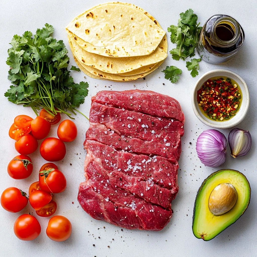 Gather these ingredients for a tasty meal. The flank steak brings a rich flavor. Olive oil keeps the steak juicy and helps the spices stick. Tortillas hold all the goodness together. Cherry tomatoes add sweetness, while avocado gives creaminess. Red onion adds a nice crunch. Fresh cilantro brightens the dish.