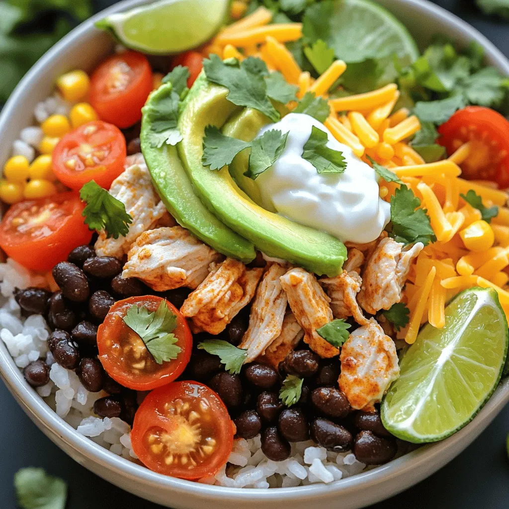 A great-looking burrito bowl makes it more fun to eat. Start with a base of jasmine rice. Then layer the chicken, beans, and corn. Add colorful toppings like cherry tomatoes and avocado. Make it pop with shredded cheese and fresh cilantro. For a fresh touch, drizzle extra lime juice on top. Serve in colorful bowls for a fun vibe. A lime wedge on the side adds a nice touch.