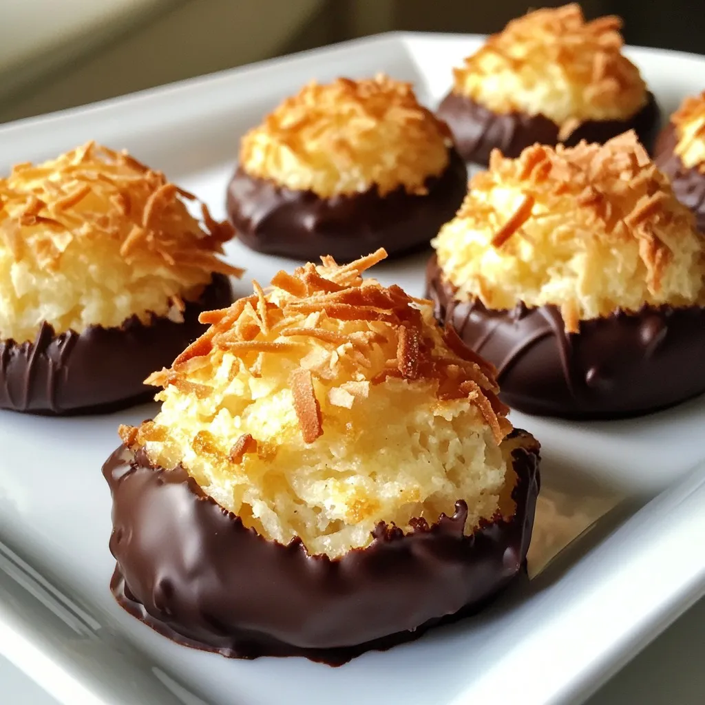 To make these delicious chocolate coconut macaroons, you need a few simple ingredients. Here’s what you will need: - 2 cups shredded unsweetened coconut - 1 cup sweetened condensed milk - 1 teaspoon vanilla extract - 1/4 teaspoon salt - 2 large egg whites - 1/2 cup dark chocolate chips - 1 tablespoon coconut oil Each ingredient plays a key role in the flavor and texture. The shredded coconut gives that chewy bite. Sweetened condensed milk adds a lovely sweetness. Vanilla extract enhances the overall flavor, while a touch of salt balances it out. Egg whites help the macaroons rise and stay fluffy. Dark chocolate chips provide a rich, chocolatey indulgence. Coconut oil not only helps melt the chocolate but also adds a hint of coconut flavor. When you gather your ingredients, make sure they are fresh and high-quality. This will make a big difference in your final dish. Enjoy the process of mixing these simple ingredients into something special! {{ingredient_image_1}} 1. First, preheat your oven to 325°F (165°C). This heat helps the macaroons bake evenly. 2. Next, prepare your baking sheet by lining it with parchment paper. This keeps the macaroons from sticking. 3. In a large bowl, mix together the shredded coconut, sweetened condensed milk, vanilla extract, and salt. Stir until everything is well combined. 1. In a separate bowl, whip the egg whites. Use an electric mixer and beat until stiff peaks form. This should take about 2-3 minutes. The stiff peaks give the macaroons their airy texture. 2. Gently fold the whipped egg whites into the coconut mixture. Be careful not to deflate the egg whites. This step is key for a light, fluffy macaroon. 1. Scoop tablespoon-sized portions of the mixture onto the prepared baking sheet. Make sure to space them about 2 inches apart. 2. Bake the macaroons in your preheated oven for 20-25 minutes. Keep an eye on them until the tops turn golden brown. 3. While the macaroons bake, melt the dark chocolate chips and coconut oil together. Use a microwave-safe bowl and heat in 30-second increments, stirring in between until smooth. 4. Once the macaroons cool for about 10 minutes, dip the bottoms in the melted chocolate. Place them back on the parchment paper. 5. For an extra touch, drizzle any remaining chocolate over the tops of the macaroons. 6. Let the chocolate set completely before serving. Enjoy your tasty creations! Getting the right texture in your macaroons is key. Start with your ingredients at room temperature. This helps the coconut and egg whites mix well. When you fold the egg whites into the coconut mix, do it gently. You want to keep as much air as possible. This makes your macaroons light and fluffy. One common mistake is overmixing your egg whites. This can make them lose their volume. Always whip them until stiff peaks form. Another mistake is not measuring your ingredients correctly. Use a scale for precision. This ensures that your macaroons turn out just right every time. To serve your macaroons, place them on a nice plate. A sprinkle of shredded coconut on top adds a great touch. You can also dust the plate with cocoa powder for style. For drinks, try pairing them with a hot cup of coffee or tea. These flavors work very well together. If you want more dessert, serve with a scoop of vanilla ice cream. Enjoy every bite! Pro Tips Use Fresh Coconut: For an extra burst of flavor, try using fresh coconut instead of shredded. Just make sure to finely chop it to maintain the texture. Temperature Matters: Ensure your egg whites are at room temperature before whipping. This helps them achieve a greater volume and stability. Chocolate Options: Experiment with different types of chocolate, like milk or white chocolate, for unique flavor profiles. You can even add a pinch of sea salt on top for contrast. Storage Tips: Store your macaroons in an airtight container at room temperature for up to a week. For longer storage, freeze them and thaw as needed. {{image_2}} You can add extra flavor to your macaroons. Try almond extract for a nutty twist. Just a teaspoon will make a big difference. You can also mix in nuts or dried fruits like almonds or cranberries. These add crunch and taste. Experiment with different flavors to find your favorite. The type of chocolate matters. You can use milk chocolate for a sweeter treat. If you prefer a richer taste, go for dark chocolate. Another fun idea is to drizzle with white chocolate. This adds a nice contrast against the dark chocolate. It also makes your macaroons look fancy! Making these macaroons fit your diet is easy. To make them gluten-free, just stick with the ingredients listed. They are naturally gluten-free as they contain no flour. For vegan alternatives, swap the sweetened condensed milk with coconut cream. You can also use aquafaba instead of egg whites. This way, everyone can enjoy them! To keep your chocolate coconut macaroons fresh, store them at room temperature. Use an airtight container to prevent them from drying out. They can stay good for about three days. If you prefer, you can also refrigerate them. Just make sure to seal them well. This keeps them moist and delicious for up to a week. You can freeze macaroons for later enjoyment. First, let the macaroons cool completely. Then, place them in a single layer on a baking sheet. Freeze them for about two hours until firm. After that, transfer them to a freezer-safe bag or container. They can last up to three months in the freezer. When you're ready to eat, simply take them out. Thaw the macaroons in the fridge overnight or at room temperature for a couple of hours. This keeps their texture nice and chewy. Chocolate coconut macaroons usually last about three days at room temperature. If you store them in the fridge, they can last up to a week. For frozen macaroons, enjoy them within three months for the best flavor. Watch for signs of spoilage, like an off smell or a change in texture. If they feel hard or dry, it’s best to toss them. Always