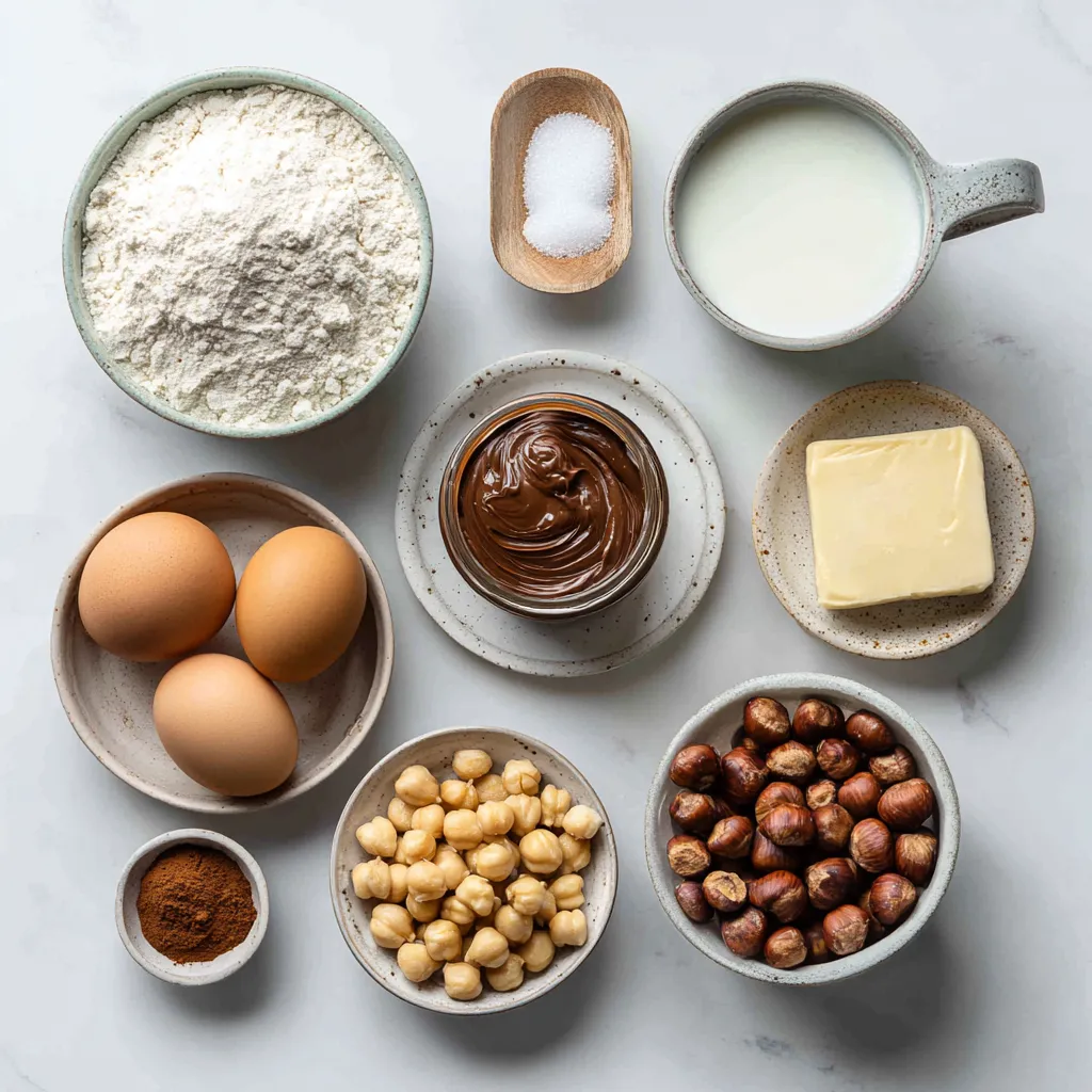 Next, melted butter adds richness. Room temperature eggs bring moisture and structure. The star of the show is the chocolate hazelnut spread. It adds a creamy, sweet filling. Chopped hazelnuts add crunch and flavor. Cocoa powder deepens the chocolate taste, and vanilla enhances the aroma.