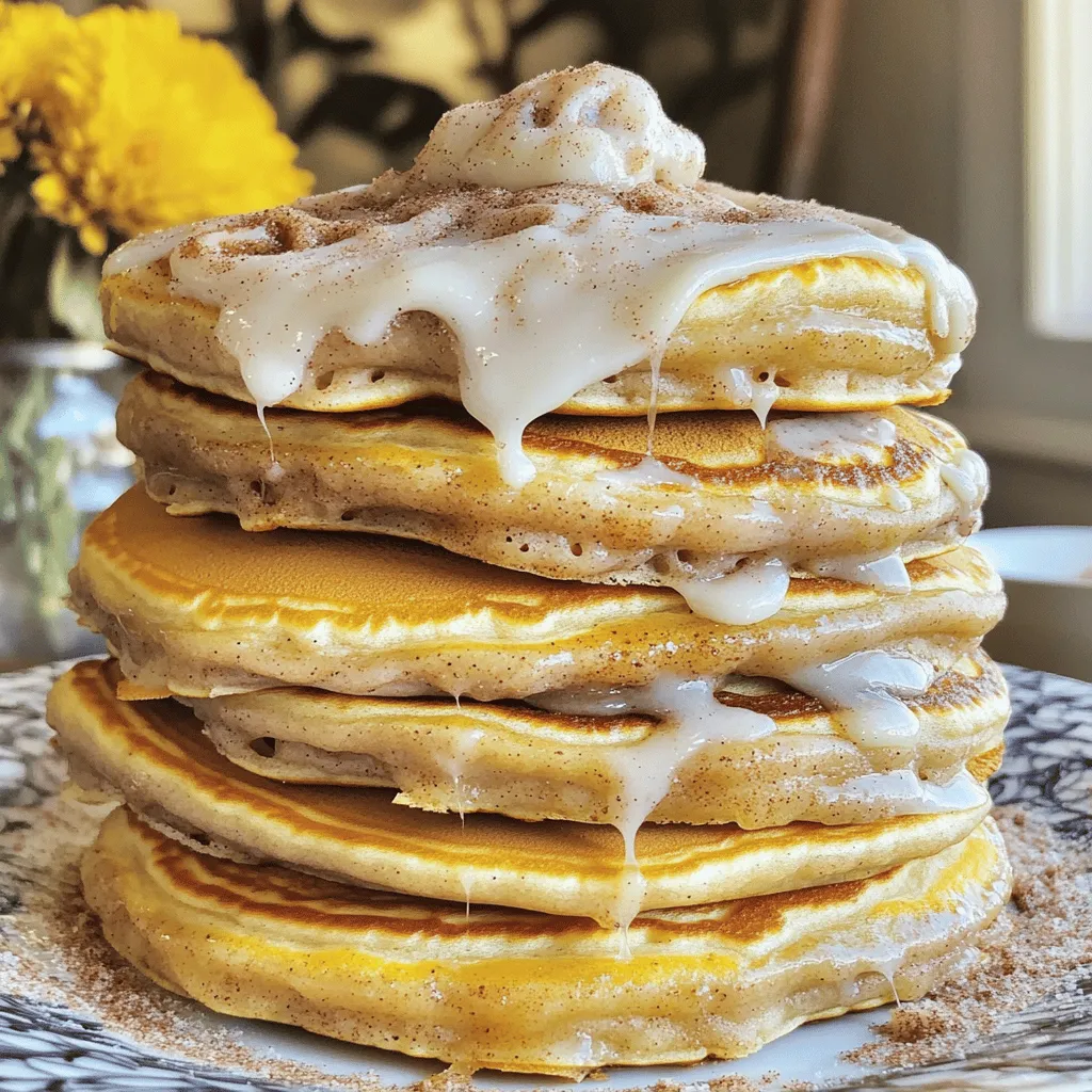 ![- 1 cup all-purpose flour - 2 tablespoons granulated sugar - 2 teaspoons baking powder - 1/2 teaspoon baking soda - 1/4 teaspoon salt - 1 cup buttermilk - 1 large egg - 2 tablespoons unsalted butter, melted - 1 teaspoon vanilla extract - 1/4 cup brown sugar, packed - 1 tablespoon ground cinnamon - 2 tablespoons unsalted butter, softened - 1/2 cup cream cheese, softened - 1/4 cup powdered sugar - 1 tablespoon milk - 1/2 teaspoon vanilla extract These ingredients create a sweet and rich breakfast. Each element plays a key role. The buttermilk gives a nice tang and fluffiness. The cinnamon swirl adds that classic cinnamon roll flavor. Finally, the cream cheese glaze brings it all together. You can find the Full Recipe for detailed steps to make this delicious treat. First, we need to mix our cinnamon swirl. In a small bowl, combine the brown sugar and ground cinnamon. Stir them until they blend well. Next, add the softened butter. Mix it all together until it forms a smooth paste. This swirl adds a sweet touch to your pancakes. Now, let’s move on to the pancake batter. In a large bowl, whisk together the flour, granulated sugar, baking powder, baking soda, and salt. In another bowl, mix the buttermilk, egg, melted butter, and vanilla extract. Pour the wet mix into the dry mix. Stir gently until just combined. It’s okay to have a few lumps. Avoid overmixing; this keeps the pancakes fluffy. Next, we need to heat our skillet. Preheat a non-stick skillet over medium heat. Lightly grease it with butter or cooking spray. Now, pour about 1/4 cup of batter onto the skillet for each pancake. Take a spoon and swirl a teaspoon of the cinnamon mixture on top. Cook until bubbles appear on the surface, about 2-3 minutes. Then, flip the pancake and cook for another 1-2 minutes until golden brown. For the full recipe, check out the details above. Enjoy your delicious cinnamon roll pancakes! To get the best pancake texture, focus on the batter. You want it thick but pourable. Mix the dry and wet ingredients until just combined. If you overmix, your pancakes can turn tough. A few lumps in the batter are okay. Resting the batter for 5 to 10 minutes helps too. This allows the flour to absorb the liquid. The pancakes will be softer and fluffier. Creating a beautiful cinnamon swirl is key. Use a squeeze bottle to control the swirl. This helps you create neat, tight spirals. If you don’t have a squeeze bottle, a zip-top bag works. Fill the bag with the cinnamon mixture and snip a corner. Squeeze gently as you swirl it onto the pancake batter. This adds visual appeal and flavor. Top your pancakes with a variety of flavors. Maple syrup is a classic choice, but try different sauces too. Fresh fruit like berries or bananas adds freshness. You can also sprinkle extra cinnamon sugar on top. For a rich touch, drizzle the cream cheese glaze. Each bite becomes a sweet delight with these toppings. {{image_2}} You can boost the flavor of your cinnamon roll pancakes. Adding a splash of vanilla makes them taste richer. You might also try a pinch of nutmeg for warmth. Different sugars can change the flavor too. For a unique twist, use light brown sugar instead of granulated sugar. You can even experiment with coconut sugar for a subtle caramel note. If you need gluten-free pancakes, swap all-purpose flour with a gluten-free mix. Make sure the mix contains a binding agent like xanthan gum. For those avoiding dairy, use almond milk or oat milk instead of buttermilk. You can replace the egg with a flaxseed meal or applesauce for a dairy-free option. Toppings can turn your pancakes into a fun treat. Fresh fruits like bananas or berries add brightness. Nuts like walnuts or pecans provide crunch and flavor. For a special touch, consider whipped cream or even a scoop of ice cream. Both options make the dish feel like dessert for breakfast. [Full Recipe] To store leftover pancakes, place them in an airtight container. Make sure they cool first. You can keep them in the fridge for up to three days. For reheating, just pop them in the microwave for about 30 seconds. Alternatively, you can use a skillet over low heat for a minute or two. This keeps them fluffy and warm. To freeze pancakes, stack them with parchment paper in between each one. Place the stack in a freezer-safe bag or container. They can last up to two months in the freezer. When you want to eat them, take out the desired number. Thaw them overnight in the fridge, then reheat in the microwave or skillet. They will taste fresh and delicious! Cinnamon roll pancakes are best eaten fresh but will last a bit. The pancakes can stay in the fridge for about three days. The cream cheese glaze lasts about a week in the fridge. Check for any changes in smell or color to spot spoilage. If you see mold, throw it out. Always trust your senses! Cinnamon roll pancakes combine two beloved treats. They blend fluffy pancakes with sweet cinnamon rolls. The taste is warm and comforting. The cinnamon swirl adds a delightful twist. The cream cheese glaze makes them even better. This dish is perfect for breakfast or brunch. You’ll impress family and friends with this tasty treat. Yes, you can prepare this dish ahead of time. You can make the pancake batter a day in advance. Store it in the fridge to keep it fresh. You can also cook the pancakes, let them cool, and then store them. Just place them in an airtight container. When you’re ready, reheat them gently on a skillet or in the microwave. This saves time on busy mornings! You can spot perfectly cooked pancakes with a few easy signs. Look for bubbles forming on the surface. This usually takes about 2-3 minutes. When the edges look set, it’s time to flip. Cook the other side until golden brown, roughly 1-2 minutes more. A good pancake should feel soft but firm when you touch it. Absolutely! You can change the glaze to fit your taste. Try adding a splash of lemon juice for a tart kick. You can also mix in some maple syrup for extra 