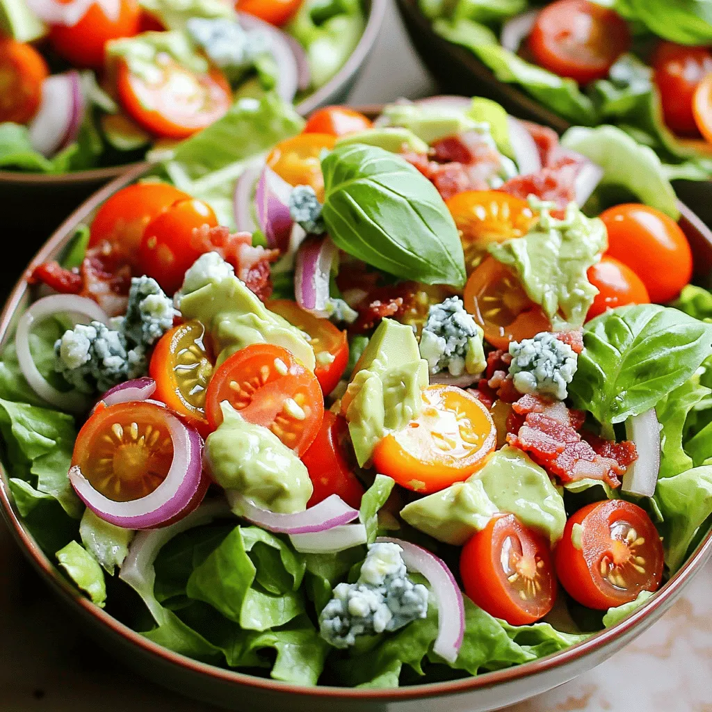 Start by layering the chopped Romaine lettuce in a large salad bowl. Next, add halved cherry tomatoes and thinly sliced red onion on top. Then, sprinkle the crumbled turkey bacon and diced avocado. For a flavorful twist, add crumbled blue cheese or feta. Finish with chopped basil leaves. Just before serving, drizzle the creamy avocado dressing over the salad. Toss gently to mix the flavors. Enjoy your fresh and vibrant Classic BLT Salad!