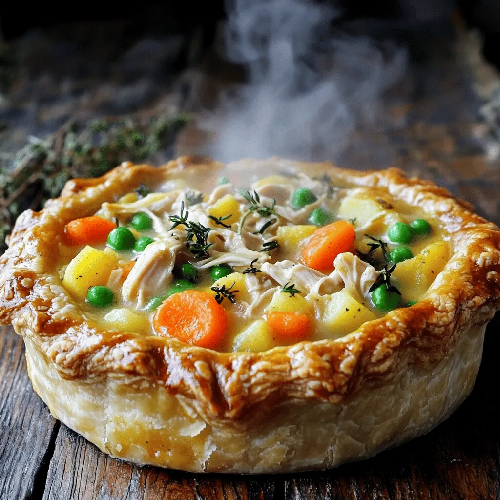 When I prepare a classic chicken pot pie, I focus on fresh and simple ingredients. Here’s what you need: - 2 cups cooked chicken, shredded - 1 cup carrots, diced - 1 cup peas (fresh or frozen) - 1 cup potatoes, diced - 1 small onion, chopped - 3 tablespoons butter - 3 tablespoons all-purpose flour - 2 cups chicken broth - 1/2 cup milk - 1 teaspoon garlic powder - 1 teaspoon dried thyme - Salt and pepper to taste - 1 package refrigerated pie crusts (or homemade crust) - 1 egg (for egg wash) These ingredients create a warm, hearty filling that comforts the soul. When I choose chicken, I often use leftover roasted chicken. This adds flavor and saves time. Fresh vegetables give the pie a bright taste. You can use frozen veggies if fresh isn’t available. They work well, too. The butter and flour create a rich base for the filling. I love adding garlic powder and thyme for extra flavor. Make sure to season with salt and pepper to bring everything together. For the crust, I typically use store-bought for convenience. But if you have time, a homemade crust can take your dish to the next level. Remember to brush the top with an egg wash. It gives the pie a golden, shiny finish. This combination of ingredients makes a chicken pot pie that everyone will love. For the full recipe, check the other sections. - Preheat Oven: Preheat your oven to 425°F (220°C). - Sauté Vegetables: Melt the butter in a large skillet. Add chopped onions, carrots, and potatoes. Cook for about 5 minutes until they start to soften. - Make Roux: Sprinkle in the flour. Stir continuously for 1-2 minutes until it's golden. - Add Broth and Milk: Gradually whisk in the chicken broth. Then add the milk, stirring until thickened, about 3-5 minutes. - Combine Filling: Stir in the cooked chicken, peas, garlic powder, thyme, salt, and pepper. Heat through until warm. - Prepare and Fill Crust: Roll out one pie crust and fit it into a 9-inch pie dish. Pour in the chicken mixture, spreading it evenly. - Top with Crust: Roll out the second pie crust and place it on top. Seal the edges by crimping with your fingers. Cut slits in the top crust for steam to escape. - Egg Wash: Beat the egg in a small bowl. Brush it over the top crust for a golden finish. - Bake: Place the pot pie in the oven. Bake for 30-35 minutes until the crust is golden brown and the filling bubbles. For more detailed instructions, check out the [Full Recipe]. Using Homemade vs. Store-Bought Crust I often use store-bought pie crusts for ease. They save time and still taste good. However, if you want to try homemade, it can add a special touch. Use cold butter and chilled water for best results. This keeps your crust flaky and light. Techniques for a Flaky Pie Crust To achieve a flaky crust, handle the dough gently. Overworking it can make it tough. When rolling out, keep it thick enough to hold the filling but thin enough to cook well. A few small slits in the top allow steam to escape, ensuring a crisp crust. Suggested Herbs and Spices I love adding herbs to boost flavor. Thyme is classic for chicken pot pie. Rosemary and parsley also work well. A pinch of garlic powder adds depth without overpowering the dish. Adding Extra Vegetables or Cheese Feel free to add more veggies. Corn, green beans, or even mushrooms can make it heartier. For a cheesy twist, sprinkle some cheddar or Gruyère before adding the top crust. This makes for a creamy, rich filling. Importance of Proper Sautéing Sautéing your vegetables is key to flavor. Start with onions; they add a sweet base. Sauté until they are soft, then add other veggies. This step builds a great flavor foundation for your filling. Tips for Thickening the Filling To ensure a thick filling, make a roux with flour and butter. Cook it briefly to remove raw flour taste. Then slowly whisk in chicken broth and milk. This helps create a silky sauce that holds everything together. {{image_2}} You can change the proteins in your chicken pot pie. Try using turkey instead of chicken. It gives a nice twist while keeping it hearty. If you want a veggie option, use mushrooms or lentils. They add great texture and flavor. For those who need gluten-free options, swap out regular flour. You can use gluten-free flour blends instead. Make sure to check for a good brand that binds well. Also, use gluten-free pie crusts, which you can find in stores. The sauce is key to a great pot pie. You can use different stocks to change the taste. Instead of chicken broth, try vegetable broth for a lighter flavor. You could even use a creamy mushroom soup for a rich twist. Cheese is another fun way to enhance your dish. Mixing in some cheddar adds a sharp bite. For a more unique taste, consider adding goat cheese or feta. This will give your pot pie a creamy texture and a burst of flavor. Make a Mexican-inspired pot pie for a fun change. Use shredded chicken and add taco seasoning. You can throw in black beans and corn for extra flavor. Top it with a sprinkle of cheese and fresh cilantro before baking. For an Asian twist, think about adding soy sauce and ginger. Use cooked chicken and mix in some snow peas and carrots. You can even top it with a flaky wonton wrapper instead of a pie crust. This brings a new crunch to your dish. Explore these variations to make your chicken pot pie your own. Don't forget to check out the Full Recipe for guidance! To store leftover chicken pot pie, let it cool first. Cover it tightly with plastic wrap or foil. You can also use an airtight container. This helps keep the pie moist and fresh. In the fridge, it lasts about 3 to 4 days. Freezing chicken pot pie is a great way to keep it longer. First, let it cool completely. Wrap it well in plastic wrap, then in foil. Label it with the date. You can freeze it for up to 3 months. To reheat, remove the wrapping. Place the pie on a baking sheet. Heat it in a 350°F (175°C) oven for about 30-40 minutes. If it’s frozen solid, it may take longer. Check that it’s hot all the 