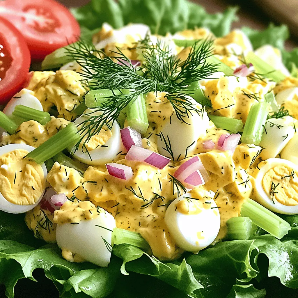 - 6 large eggs - 1/4 cup mayonnaise - 1 tablespoon Dijon mustard - 1 tablespoon lemon juice - 1/4 cup celery, finely chopped - 1/4 cup red onion, finely chopped - 1 tablespoon fresh dill (or 1 teaspoon dried dill) - Salt and pepper to taste - Lettuce leaves (for serving) - Whole grain bread or wraps (optional) When making classic egg salad, I focus on fresh, high-quality ingredients. The base starts with eggs, which are rich in protein and flavor. I always choose large eggs for a nice, creamy texture. Mayonnaise adds creaminess, while Dijon mustard gives a tangy kick. Lemon juice brightens the dish and adds a fresh taste. Next, I add crunch and flavor with finely chopped celery and red onion. The celery adds a nice bite, while the onion gives a mild sweetness. Dill is a must for that classic flavor. I recommend using fresh dill when possible, but dried dill works too. For serving, you can keep it simple with lettuce leaves. They make a great base for the egg salad. If you prefer a sandwich, whole grain bread or wraps are perfect. They add a hearty touch and are great for lunch! Check the Full Recipe for more details on how to prepare this delicious egg salad. How to hard boil eggs properly To hard boil eggs, place them in a saucepan. Cover them with cold water. Heat on medium-high until it boils. Once boiling, cover the pan and turn off the heat. Let the eggs sit for 12-15 minutes. Cooling and peeling the eggs After 12-15 minutes, transfer the eggs to a bowl of ice water. Let them cool for about 5 minutes. Once they cool, tap each egg on the counter to crack the shell. Peel the eggs under running water for easier removal. Making the dressing with mayonnaise, mustard, and lemon juice In a mixing bowl, combine 1/4 cup of mayonnaise, 1 tablespoon of Dijon mustard, and 1 tablespoon of lemon juice. Stir well until it looks creamy and smooth. Gently combining all ingredients Chop the cooled eggs into small pieces. Add them to the bowl with the dressing. Then, add 1/4 cup of finely chopped celery, 1/4 cup of finely chopped red onion, and 1 tablespoon of fresh dill. Fold everything together gently. Best ways to serve egg salad: in lettuce wraps or on bread For serving, you can use lettuce leaves as wraps. This keeps it light and fresh. You can also spread the egg salad between slices of whole grain bread or in wraps. Presentation tips to enhance visual appeal To make it look nice, serve the egg salad on a colorful plate. Add extra fresh dill on top. A few slices of tomato will add a pop of color. Enjoy your Classic Egg Salad Delightful and Easy Recipe! For the full recipe, check out the details above. - To boil eggs, place them in a pan and cover with water. - Bring the water to a boil over medium-high heat. - Once boiling, cover the pan and turn off the heat. - Let the eggs sit for 12-15 minutes. - Transfer eggs to ice water to cool for 5 minutes. - For peeling, tap the shell gently and start from the large end. - For flavor, add more mustard for tang or lemon juice for zest. - Overmixing can make your egg salad mushy. - Skip no seasoning; salt and pepper are key for taste. - You can prepare egg salad a day in advance. - Store it in an airtight container in the fridge. - For freshness, consume within three days. {{image_2}} You can change the flavor of your egg salad with fresh herbs. Adding chopped basil or chives gives a bright taste. For a spicy kick, try diced jalapeño or a splash of hot sauce. These herbs and spices can make a simple dish feel special. Experiment with different herbs to find your favorite mix! Feel free to swap out some ingredients in your egg salad. If you want a lighter option, use Greek yogurt or mashed avocado instead of mayonnaise. You can also add fun ingredients like crispy bacon, sweet peas, or tangy pickles. These swaps add texture and flavor, making your salad unique. For those following a vegan or vegetarian diet, you can still enjoy egg salad. Use tofu or chickpeas to replace the eggs. For a low-carb option, skip the bread and serve it in lettuce wraps. These adjustments cater to different diets while keeping your egg salad tasty and satisfying. For the full recipe, check out the Egg-cellent Classic Egg Salad. To keep your egg salad fresh, store it in the refrigerator right away. Place it in an airtight container to prevent air exposure. This helps maintain its creamy texture. I recommend using glass or BPA-free plastic containers. They seal well and do not retain odors. For the best taste, eat your egg salad within three to five days. Any longer, and the flavors start to fade. Look for signs of spoilage, like an off smell or changes in texture. If it looks watery or has an unusual color, it's better to toss it. You can freeze egg salad, but I don’t recommend it. Freezing changes the texture and makes it watery. If you decide to freeze it, use a freezer-safe container and leave some space for expansion. When ready to eat, thaw it in the fridge overnight. Use it within a day or two after thawing for the best flavor. Homemade egg salad lasts about 3 to 5 days in the fridge. Store it in an airtight container for best results. Always check for any off-smells or changes in texture before eating. If you see any signs of spoilage, it’s best to discard it right away. Keeping it cold is key to maintaining its freshness. Yes, you can use different types of mustard in egg salad. Each mustard adds its own unique flavor. For a milder taste, yellow mustard works well. If you want a sharper kick, try spicy brown mustard. Honey mustard adds sweetness, while Dijon gives a tangy twist. Experiment with what you like best! Egg salad pairs well with several side dishes. Fresh veggies like carrot sticks or cucumber slices offer a nice crunch. You can also serve it with chips for some extra texture. A light salad with greens makes a refreshing side. For a heartier meal, try pairing it with soup. These sides complete your meal nicely! In this blog post, we explored how to make th