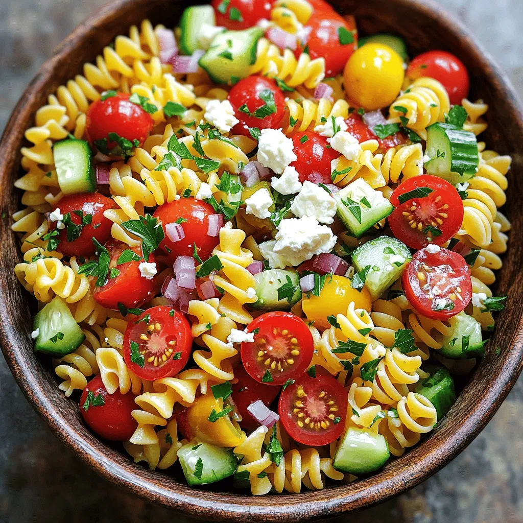 Now it’s time to mix everything. In a large bowl, add the cooked pasta. Then, add 1 cup of halved cherry tomatoes and 1 diced cucumber. Toss in 1 chopped bell pepper, either red or yellow. Next, add 1/2 finely chopped red onion and 3/4 cup of sliced Kalamata olives. Crumble in 1 cup of feta cheese for a creamy touch. Gently stir everything together. Pour the dressing over the pasta mix and toss it again until all ingredients are coated. Finally, fold in 1/4 cup of chopped fresh parsley. This adds a nice fresh taste. Cover the salad and let it chill in the fridge for at least 30 minutes before serving. This waiting time lets the flavors blend nicely.