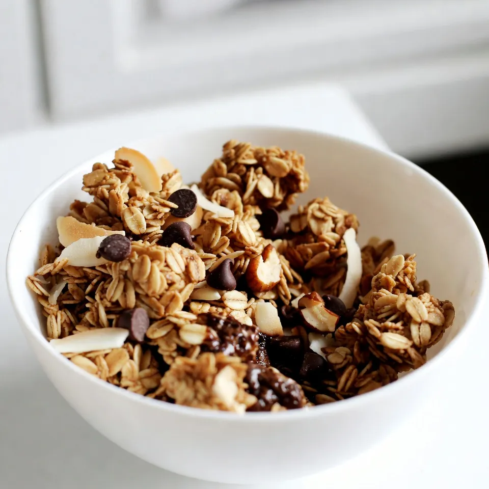 A delicious and crunchy granola made with coconut and dark chocolate chips, perfect for breakfast or a snack.