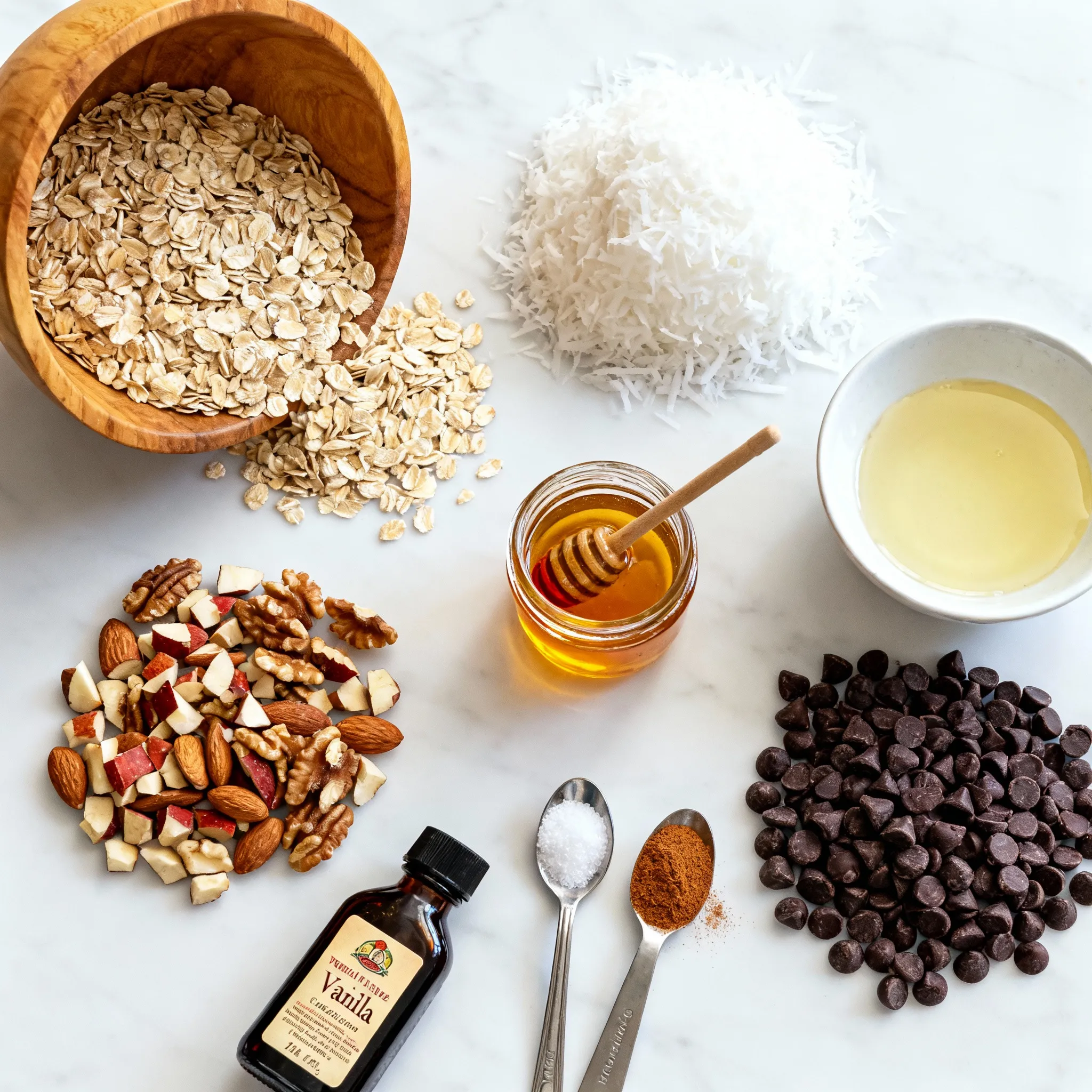 These ingredients form the base of your granola. Rolled oats give it texture, while coconut adds flavor. Nuts add crunch, and chocolate gives sweetness.