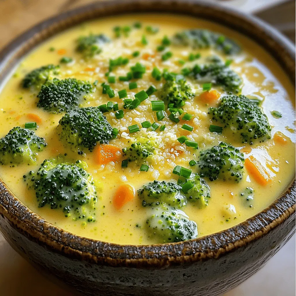 - 1 tablespoon olive oil - 1 small onion, diced - 2 cloves garlic, minced - 4 cups broccoli florets (fresh or frozen) - 4 cups vegetable broth - 2 medium carrots, diced - 1 teaspoon dried thyme - 1 teaspoon mustard powder - 1 cup heavy cream - 2 cups shredded sharp cheddar cheese - Salt and pepper to taste - ¼ cup grated Parmesan cheese (for garnish) - Fresh chives, chopped (for garnish) The first step in making creamy broccoli cheddar soup is gathering the right ingredients. Fresh or frozen broccoli florets work well. I love using sharp cheddar to give the soup a bold flavor. The heavy cream adds richness and creaminess. - If you want a lighter soup, use milk instead of heavy cream. - For a dairy-free version, try coconut milk or almond milk. - You can mix different cheeses, like gouda or mozzarella, for fun flavors. These substitutions allow you to tailor the soup to your taste or dietary needs. Remember, the key is to keep the balance of flavors. - Each serving has about 350 calories. - It provides a good mix of carbs, fats, and protein. - Broccoli is full of vitamins and fiber, making this soup a healthy choice. Broccoli offers benefits like supporting digestion and boosting the immune system. This soup not only comforts you but also nourishes your body. First, I heat the olive oil in a large pot over medium heat. I add the diced onion and sauté it for about five minutes. The onion becomes soft and clear. Then, I toss in the minced garlic and cook for one more minute. The garlic should smell great at this point. Next, I stir in the broccoli florets and diced carrots. I cook them for three to four minutes. They should start to soften but not lose their crunch. After that, I pour in the vegetable broth. I also add the dried thyme and mustard powder. I bring the mix to a simmer and cook for about 15 minutes. The broccoli should be tender but still bright green. For blending, I love using an immersion blender. It makes the soup so smooth without extra dishes. I blend until it reaches my favorite texture—smooth or a bit chunky. If I don’t have an immersion blender, I pour the soup into a countertop blender. I do this in batches, making sure not to fill it too high. Now it’s time for the best part! I return the blended soup to the pot and stir in the heavy cream. I heat it gently over low to medium heat. I want it warm but not boiling. Then, I add the shredded sharp cheddar cheese slowly. I stir until it’s fully melted and mixed in. Finally, I season with salt and pepper to taste. For a nice finish, I garnish each bowl with grated Parmesan cheese and chopped fresh chives. To make your soup shine, sauté the onions well. Heat olive oil in a pot. Add diced onions and cook until they turn soft and clear, about five minutes. This step builds a strong flavor base. When you add garlic, do not cook it too long. One minute is perfect to keep its fresh taste. When adding cream, keep the heat low. This avoids curdling. Stir in the cream gently after blending the soup. Heat it just enough to warm through. If it boils, the cream may separate, which you want to avoid. You can add spices to boost the flavor. Try a pinch of smoked paprika or a dash of cayenne for warmth. A sprinkle of nutmeg adds a nice depth too. Balance flavors with salt and pepper. Taste as you go to find the right balance. Serve this soup with crusty bread or a fresh salad. A simple garden salad pairs well. For a fun twist, use a bread bowl. It's a delicious way to enjoy every bit of the soup. Garnish with grated Parmesan and chopped chives for added color and taste. You can also add a drizzle of olive oil for richness. {{image_2}} You can change the cheese to fit your taste. Cheese blends work great. Try mixing sharp cheddar with Gruyère for a rich flavor. If you want a lighter taste, use mozzarella. For those who prefer vegan options, there are tasty vegan cheeses. Look for brands that melt well. They can replace dairy cheese nicely. Want to make it heartier? Add protein! Chicken or bacon can add great flavor. Cook the chicken in the soup or add crispy bacon on top. You can also add more veggies. Peas, corn, or even spinach can add color and flavor. Just toss them in with the broccoli and carrots. Seasonal changes can spice up this soup. In spring, add fresh peas for a pop of sweetness. They cook fast and add a nice crunch. In fall, try pumpkin or squash. They add creaminess and a touch of sweetness. Just roast them first for extra flavor. These changes keep the soup fresh all year round. To store your creamy broccoli cheddar soup, first let it cool. Then, pour it into an airtight container. This keeps it fresh and tasty. It will stay good in the fridge for about 3 to 4 days. Always check for any changes in smell or color before enjoying it again. If you want to keep the soup longer, freezing is a great option. Start by letting the soup cool completely. Pour it into freezer-safe bags or containers. Leave some space at the top, as the soup will expand. It can last in the freezer for up to 3 months. When you’re ready to eat, thaw it overnight in the fridge. To reheat, warm it gently on the stove, stirring well. You might need to add a splash of broth or cream to restore its creaminess. You can make this soup ahead of time for easy meals. Cook a big batch and store it as I mentioned earlier. Portion it into containers for quick lunches or dinners. You can also freeze individual servings for even more convenience. This way, you’ll always have a warm bowl of comfort ready when you need it! To thicken your broccoli cheddar soup, you can use several common thickening agents. Here are a few options: - Cornstarch: Mix equal parts cornstarch and cold water. Stir this into the soup and let it cook until thickened. - Flour: Make a roux by cooking equal parts flour and butter, then add this to the soup. - Potatoes: Add diced potatoes while cooking. They can break down and thicken the soup naturally. - Cream: A bit more heavy crea