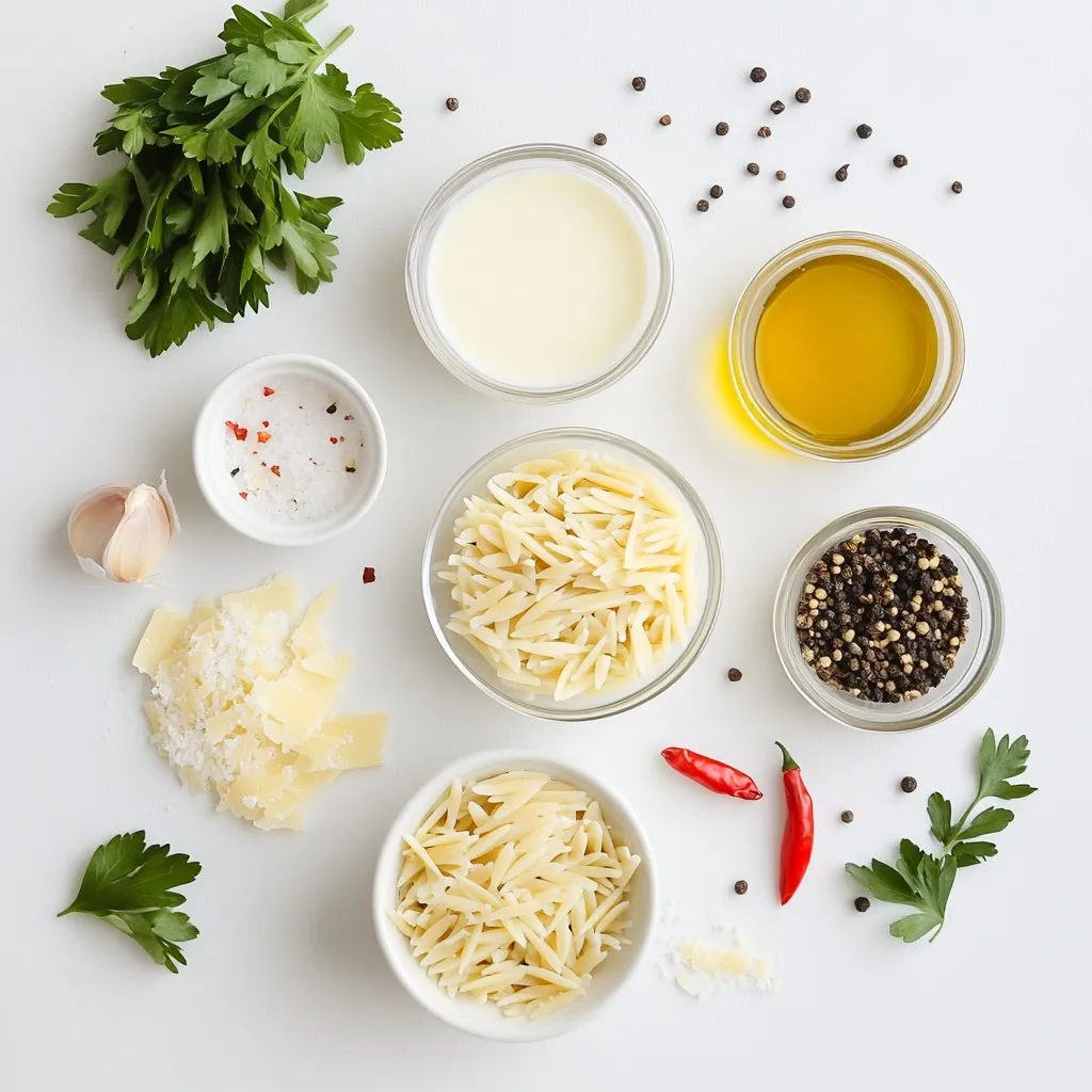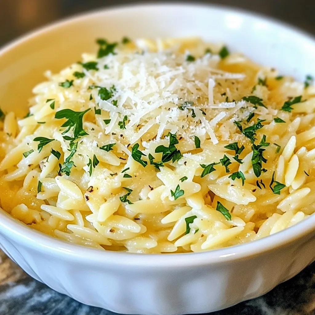 - 1 cup orzo pasta - 2 tablespoons olive oil - 3 cloves garlic, minced - 2 cups vegetable broth - 1 cup heavy cream - 1 cup grated Parmesan cheese - 1/2 teaspoon salt - 1/4 teaspoon black pepper - 1/4 teaspoon red pepper flakes (optional) - 2 tablespoons fresh parsley, chopped (for garnish) You can swap the vegetable broth for chicken broth if you prefer. This change adds a richer flavor. For a lighter dish, use half-and-half instead of heavy cream. If you want a nutty taste, use Pecorino Romano cheese in place of Parmesan. Fresh garlic is key for the best taste. Using fresh ingredients makes a big difference. Fresh garlic gives bold flavor and aroma. Fresh herbs, like parsley, add a pop of color and taste. High-quality Parmesan cheese melts beautifully, creating a creamy texture. Always choose fresh, vibrant ingredients for the best results. They make your dish more enjoyable and delicious. {{ingredient_image_1}} Start by gathering all your ingredients. You will need: - 1 cup orzo pasta - 2 tablespoons olive oil - 3 cloves garlic, minced - 2 cups vegetable broth - 1 cup heavy cream - 1 cup grated Parmesan cheese - 1/2 teaspoon salt - 1/4 teaspoon black pepper - 1/4 teaspoon red pepper flakes (optional) - 2 tablespoons fresh parsley, chopped (for garnish) Make sure to measure everything out. This makes cooking smooth and easy. Heat a large skillet over medium heat. Pour in the olive oil. This will help the garlic cook nicely. Add the minced garlic and sauté for about one minute. Watch it closely to prevent burning. Next, stir in the orzo. Cook it for one to two minutes. This toasts the pasta a bit, giving it great flavor. Now, pour in the vegetable broth. Bring it to a boil, then reduce the heat. Let it simmer for about ten minutes. Stir it occasionally. You want the orzo to be al dente and most of the liquid absorbed. After that, lower the heat again. Add in the heavy cream and grated Parmesan cheese. Mix well until the cheese melts. Add salt, black pepper, and red pepper flakes if you like a little heat. Remove the skillet from heat. Let it sit for a couple of minutes. This helps the dish thicken. Taste it and adjust the seasoning if you need. Finally, serve the orzo in shallow bowls. Drizzle with more olive oil and sprinkle extra Parmesan and parsley on top. Enjoy your creamy garlic Parmesan orzo! To cook orzo just right, start with a large pot. Use plenty of water, like for regular pasta. Bring the water to a boil before adding the orzo. Stir it well as it cooks. This helps keep it from sticking together. Cook orzo until it's al dente, which means it should still have a slight bite. This usually takes about 10 minutes. To make your orzo even more tasty, add fresh herbs and spices. Fresh parsley gives a nice touch. You can also try adding basil or thyme for a twist. If you like a kick, toss in some red pepper flakes. They bring heat without overpowering the dish. Always taste as you go. This way, you can adjust the flavors to your liking. One common mistake is overcooking the orzo. It can turn mushy and lose its texture. Keep an eye on the time and taste it as it cooks. Another mistake is not using enough salt. It’s vital to season the broth and cream well. Lastly, don’t skip the resting time after cooking. Letting the dish sit for a few minutes helps thicken the sauce and meld the flavors. Enjoy your creamy garlic Parmesan orzo! Pro Tips Perfectly Toasted Orzo: Toasting the orzo in olive oil before adding the broth enhances its nutty flavor. Keep an eye on it to prevent burning. Use Fresh Ingredients: Fresh garlic and parsley will elevate the dish's taste. Avoid dried garlic to maximize flavor. Adjust Consistency: If the orzo becomes too thick, add a splash of vegetable broth or cream to reach your desired creaminess. Experiment with Cheese: While Parmesan is classic, mixing in other cheeses like Pecorino Romano or fontina can add depth to the flavor. {{image_2}} You can make Creamy Garlic Parmesan Orzo even better by adding veggies. Some great options include spinach, peas, or cherry tomatoes. To add them, simply toss in your chosen vegetables when you stir in the orzo. For instance, add fresh spinach during the last few minutes of cooking. It wilts down nicely and adds a pop of color and flavor. If you prefer peas, mix them in with the broth. They cook quickly and stay sweet and vibrant. Want to turn this dish into a filling meal? Consider adding protein. You can use cooked chicken, shrimp, or even crispy bacon. If you choose chicken, diced rotisserie chicken works well. Just mix it in before serving. For shrimp, add them to the skillet a few minutes before the orzo is done. They will cook fast and add a lovely seafood taste. Bacon lovers can sprinkle in crispy bits after cooking. This will give your orzo a tasty crunch. While Parmesan cheese gives a great flavor, you can switch it up. Try using pecorino romano for a sharper taste. Feta cheese can also work for a tangy twist. If you want a creamy texture without dairy, opt for nutritional yeast. It adds a cheesy flavor without the milk. Just mix in the cheese of your choice at the end. This way, you get a delicious sauce that suits your taste. To store your Creamy Garlic Parmesan Orzo, let it cool to room temperature. Then, place it in an airtight container. Store it in the fridge for up to three days. For best taste, consume it within this time. If you have a large batch, consider dividing it into smaller portions. This makes it easy to reheat later. When you are ready to enjoy your leftovers, heat them gently. You can use the stovetop or microwave. If using the stovetop, add a splash of vegetable broth or cream. This helps restore the creamy texture. Heat over low heat, stirring often. If using the microwave, cover the dish with a lid. Heat in short intervals, stirring in between. This keeps the orzo from drying out. If you want to save orzo for later, freezing is a great option. First, let it cool completely. Then, transfer