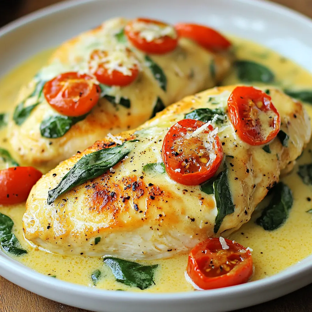 A delicious and creamy chicken dish with garlic, spinach, and tomatoes.