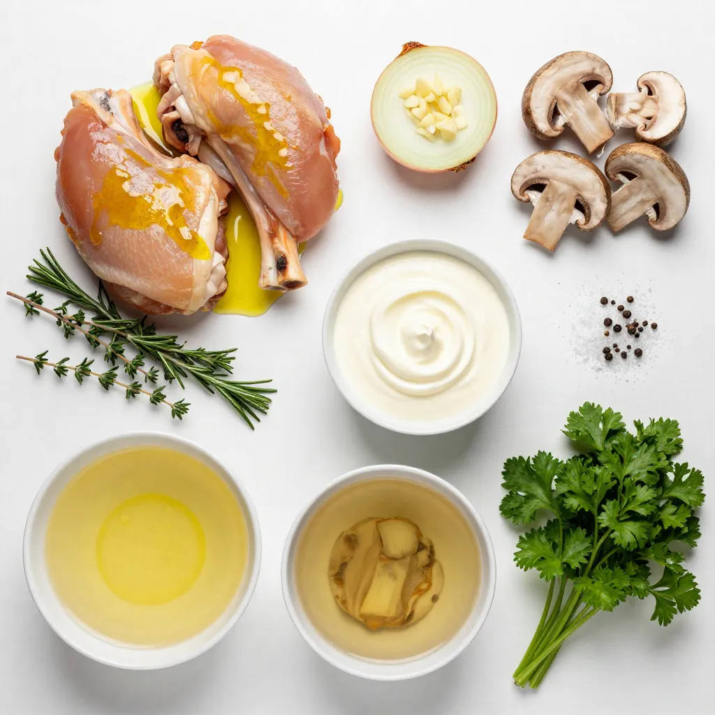 - 4 bone-in, skin-on chicken thighs - 1 tablespoon olive oil - 1 medium onion, chopped - 3 cloves garlic, minced - 8 ounces cremini mushrooms, sliced - 1 cup heavy cream - 1 cup chicken broth - 1 teaspoon dried thyme - 1 teaspoon dried rosemary - Salt and pepper to taste - Fresh parsley, chopped (for garnish) You can swap bone-in thighs for boneless ones. They cook faster. Use any cooking oil instead of olive oil. If you want a lighter dish, use half-and-half instead of heavy cream. For mushrooms, try button or shiitake mushrooms. Both will add great flavor. If you lack fresh herbs, use dried ones, but cut the amount in half for best results. Choose chicken thighs with a pink hue and no odor. The skin should be smooth, not slimy. For onions, look for firm, heavy bulbs without soft spots. Garlic should be firm and dry, not sprouted. When picking mushrooms, choose ones that are firm and dry, with no dark spots. Fresh parsley should be vibrant green, not wilted. These simple tips help ensure you make the best dish possible. {{ingredient_image_1}} 1. Start by patting the chicken thighs dry. This helps the skin get crispy. 2. Season both sides with salt and pepper. Use a good amount for flavor. 3. Chop one medium onion and mince three cloves of garlic. These add great taste. 4. Slice eight ounces of cremini mushrooms. They bring a rich, earthy flavor. 1. Heat one tablespoon of olive oil in a large skillet over medium-high heat. 2. Once hot, add the chicken thighs skin-side down. Sear for about 5-7 minutes. 3. Flip the chicken and cook for another 5 minutes. The skin should be golden brown. 4. Remove the chicken from the skillet and set it aside on a plate. 5. In the same skillet, add the chopped onion. Sauté for 2-3 minutes until it turns translucent. 6. Next, add the minced garlic. Cook for another minute until it smells great. 7. Toss in the sliced mushrooms. Cook for about 5 minutes until they brown and lose moisture. 8. Pour in one cup of chicken broth. Scrape up any brown bits from the skillet. 9. Stir in one cup of heavy cream, one teaspoon of dried thyme, and one teaspoon of dried rosemary. 10. Bring the mixture to a gentle simmer. This will create a creamy sauce. 11. Return the chicken thighs to the skillet, skin-side up. Spoon some sauce over the top. 12. Cover the skillet and reduce the heat to low. Let it simmer for 20-25 minutes. 13. Check that the chicken reaches an internal temperature of 165°F (75°C). 1. Taste the sauce and adjust seasoning if needed. A little extra salt can help. 2. Serve the creamy mushroom chicken thighs over mashed potatoes or rice. 3. Drizzle more sauce on top. This makes the dish look delicious. 4. Garnish with chopped fresh parsley. It adds color and freshness. To ensure chicken thighs cook well, start with dry skin. Pat them with paper towels. Season both sides with salt and pepper. Heat olive oil until hot in your skillet. Place the chicken skin-side down and sear for 5-7 minutes. This makes the skin crispy. Flip and cook for another 5 minutes. The internal temperature should reach 165°F (75°C) for safety. To make the sauce richer, use heavy cream. Sauté onions and garlic until soft and fragrant. Cook the mushrooms until they release moisture, then add chicken broth. This adds depth. For flavor, include dried thyme or rosemary. Let the sauce simmer gently. This allows the flavors to blend well. If you want more taste, adjust the seasoning at the end. Avoid cooking chicken straight from the fridge. Let it sit at room temperature for about 15 minutes. This helps with even cooking. Don’t rush the searing process; give it time to brown. Also, don’t skip the simmering step. It helps the chicken absorb the sauce's flavor. Finally, taste the sauce before serving. Adjusting the seasoning is key for a great dish. Pro Tips Use Fresh Herbs: Fresh thyme and rosemary can elevate the flavor of the dish significantly compared to dried herbs. Perfectly Sear the Chicken: Make sure the pan is hot before adding the chicken to achieve a crispy skin. Deglaze the Pan: Scraping up the brown bits after cooking the onions and garlic adds a rich flavor to the sauce. Let it Rest: Allow the chicken to rest for a few minutes after cooking to keep it juicy and tender. {{image_2}} If you want to switch things up, try other proteins. Boneless chicken thighs work great too. You can also use chicken breasts if you prefer. For a meatless option, mushrooms can shine as the star. Try using portobello mushrooms. They have a meaty texture and add depth to the dish. Mushrooms add flavor and texture to your meal. While cremini mushrooms are a favorite, you can experiment with others. Shiitake mushrooms bring a rich taste that many love. Button mushrooms are mild but can still enhance the dish. Mix different types for a fun twist! Herbs and spices can change the game for this recipe. You can add fresh thyme or rosemary for a stronger taste. A pinch of red pepper flakes can give a nice kick. For a hint of sweetness, try adding some balsamic vinegar. This will brighten the creamy sauce and impress your family. To store leftovers, let the chicken cool first. Place it in an airtight container. Make sure to add the sauce too. Store in the fridge for up to three days. This keeps the chicken moist and tasty. When you're ready to eat, take the chicken out. You can reheat it in a skillet over medium heat. Add a splash of chicken broth to keep it moist. Stir until hot, which takes about 5-10 minutes. You can also use a microwave. Heat on medium for about 2-3 minutes. Cover it to keep the steam in. To freeze the dish, let it cool completely. Transfer the chicken and sauce into a freezer-safe bag. Try to remove as much air as possible. Label the bag with the date. You can freeze it for up to three months. When you’re ready to use it, thaw it in the fridge overnight. Reheat it as mentioned before. Enjoy your creamy mushroom chicken thighs anytime! Yes, you can use boneless chicken thighs. They 