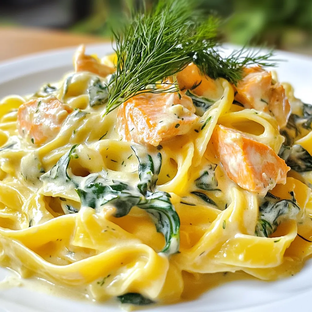 A delicious and creamy pasta dish featuring fresh salmon and spinach.
