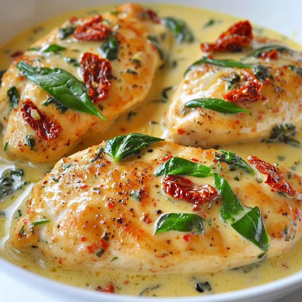 A delicious and creamy chicken dish featuring sun-dried tomatoes and spinach, perfect for a comforting meal.