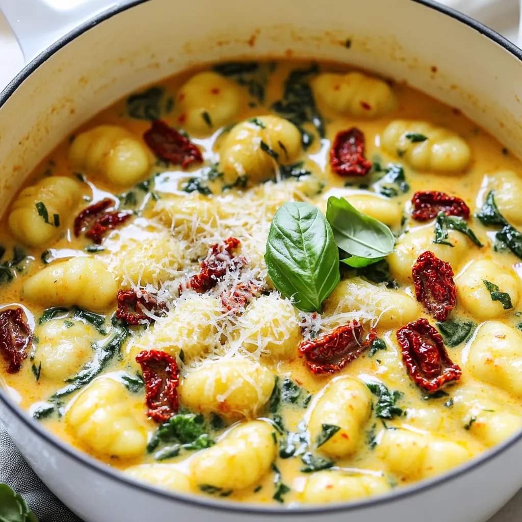 To make this dish even more exciting, think about adding fresh herbs. Basil or thyme can elevate the taste. Stir in a handful of fresh basil at the end for a bright finish. You could also sprinkle in some lemon zest for a bit of zing. If you love spice, increase the red pepper flakes or add a dash of hot sauce. Next, try a splash of balsamic vinegar for a sweet touch that balances the creaminess. These small tweaks can bring new life to your creamy sun-dried tomato gnocchi.