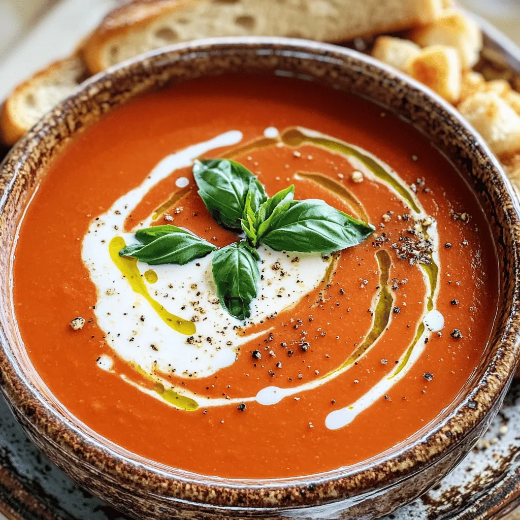 To make creamy tomato basil soup, gather these items: - 2 tablespoons olive oil - 1 medium onion, chopped - 2 cloves garlic, minced - 1 can (28 oz) crushed tomatoes - 2 cups vegetable broth - 1 teaspoon sugar - 1 teaspoon dried oregano - Salt and pepper to taste - 1 cup heavy cream (or coconut cream for a vegan option) - 1/2 cup fresh basil leaves, chiffonade - Crusty bread or croutons for serving Each ingredient plays a big role in taste. - Olive oil adds richness and flavor. - Onion and garlic bring sweetness and depth. - Crushed tomatoes form the soup’s base, offering a bright, tangy flavor. - Vegetable broth enhances the soup’s savory notes. - Heavy cream makes it rich and smooth, while coconut cream is a great vegan choice. - Fresh basil adds a fragrant touch that brightens the dish. You can swap some ingredients if needed. - Use butter instead of olive oil for a different flavor. - Fresh tomatoes can replace canned tomatoes if you have them. - For a lighter version, try using half-and-half instead of heavy cream. - If you want more heat, add a pinch of red pepper flakes. Check the full recipe for more details and enjoy making your soup! To start, gather all your ingredients. This helps you stay organized. You’ll need: - 2 tablespoons olive oil - 1 medium onion, chopped - 2 cloves garlic, minced - 1 can (28 oz) crushed tomatoes - 2 cups vegetable broth - 1 teaspoon sugar - 1 teaspoon dried oregano - Salt and pepper to taste - 1 cup heavy cream (or coconut cream) - 1/2 cup fresh basil leaves, chiffonade - Crusty bread or croutons for serving Next, chop the onion and mince the garlic. This step is key for great flavor. In a large pot, heat the olive oil over medium heat. Add the chopped onion and sauté until it turns translucent, about 5 minutes. Stir in the minced garlic and cook for one more minute. The aroma will fill your kitchen! Now, pour in the crushed tomatoes and vegetable broth. Add the sugar, oregano, salt, and pepper. Stir everything well. Bring the soup to a simmer and let it cook for 20 minutes. This allows the flavors to meld beautifully. After simmering, it’s time to blend. Use an immersion blender for a smooth texture. If you don’t have one, carefully transfer the soup to a stand blender in batches. Once blended, return it to the pot if needed. Stir in the heavy cream until it mixes well. Finally, add the fresh basil and cook for another 5 minutes on low heat. When blending hot soup, be careful! Hot liquid can splatter. If using a stand blender, fill it halfway. Leave space for the steam. Always start on a low speed and increase gradually. This keeps your kitchen mess-free. For the best taste, adjust the seasoning after blending. Now you’re ready to enjoy a warm bowl of creamy tomato basil bliss! Don’t forget to check the [Full Recipe] for complete details. After you make your creamy tomato basil soup, let it cool before storing. Use an airtight container for best results. The soup lasts in the fridge for up to five days. If you want to save it for longer, freeze it in portions. It can stay in the freezer for up to three months. To reheat, place the soup in a pot over low heat. Stir often to avoid sticking. If the soup thickens too much, add a splash of broth or water. You can also microwave it in a bowl. Heat it in 30-second intervals, stirring in between. You can boost the flavor of your soup in several ways. Try adding fresh herbs like thyme or parsley. You can also use smoked paprika for a nice depth. A squeeze of lemon juice adds brightness. If you enjoy spice, add a pinch of red pepper flakes. For a richer taste, mix in some Parmesan cheese while cooking. One common mistake is not balancing the flavors. Always taste and adjust. If the soup is too acidic, add more sugar. If it's bland, salt can help. Another mistake is overcooking the cream. Add it only after blending the soup for a silky texture. Lastly, using low-quality tomatoes can affect the taste. Choose high-quality canned tomatoes for the best results. You can find the full recipe [here](#). {{image_2}} To make a vegan creamy tomato basil soup, swap the heavy cream for coconut cream. It gives a rich and creamy texture while keeping it dairy-free. Use vegetable broth instead of chicken broth to keep it vegan. Fresh basil adds a lovely taste and aroma, so don't skip it! If you like heat, add red pepper flakes or diced jalapeños to the pot. Start with a small amount, then taste and add more if you want. This extra spice can make your creamy tomato basil soup exciting. You can also mix in a splash of hot sauce before serving for a spicy kick. For a cheesy twist, stir in grated Parmesan or mozzarella while blending. This adds a depth of flavor and a fun texture. You can also top the soup with shredded cheese before serving. Melted cheese on top makes the soup even more comforting and indulgent. You can discover more about these variations in the Full Recipe. Store your creamy tomato basil soup in an airtight container. This keeps the soup fresh. Let it cool to room temperature first. Refrigerate the soup for up to five days. When you want to eat it, reheat it gently on the stove. Stir often to avoid burning. Freezing is a great way to save extra soup. Use freezer-safe containers or bags. Leave some space for the soup to expand when frozen. The soup can last for about three months in the freezer. When you’re ready to eat, thaw it in the fridge overnight. Reheat it on the stove, stirring well. You can get creative with leftovers. Add them to pasta for a quick meal. Use them as a sauce for baked chicken. Mix with rice or quinoa for a tasty side. You can even pour it over roasted veggies. This way, you enjoy every last drop of your creamy tomato basil soup. For the full recipe, check out the original article. Yes, you can use fresh tomatoes. Choose ripe tomatoes for the best flavor. You will need about 2 pounds of fresh tomatoes. First, blanch them in boiling water for a minute. Then, put them in