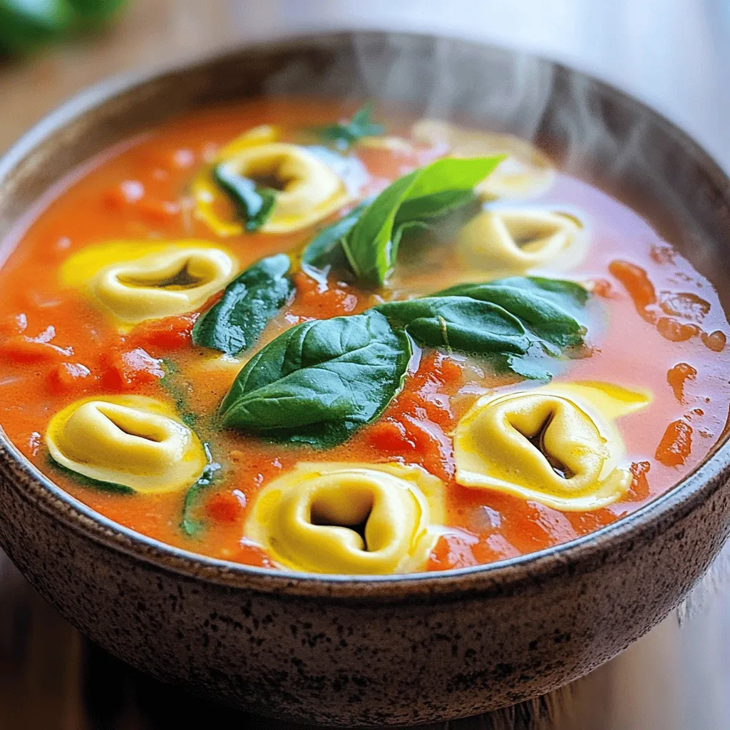To make this soup, you need a few key items: - 2 tablespoons olive oil - 1 medium onion, diced - 3 cloves garlic, minced - 1 can (28 oz) crushed tomatoes - 4 cups vegetable broth - 1 teaspoon dried oregano - 1 teaspoon dried basil - Salt and pepper to taste - 2 cups fresh spinach - 1 package (9 oz) cheese tortellini - 1 cup heavy cream - Fresh basil leaves for garnish These ingredients work together to create a rich and creamy soup. The crushed tomatoes give it a nice base, while the tortellini adds texture and flavor. Using high-quality ingredients makes a big difference. Choose extra virgin olive oil for its flavor. Fresh garlic adds a sharp taste that dried garlic cannot match. Buy good-quality crushed tomatoes. Look for brands that use fresh tomatoes for best taste. Fresh spinach should be vibrant and crisp. For tortellini, opt for brands that use real cheese. Their flavor shines in the soup. If you need to make changes, you can. Use vegetable broth instead of chicken broth for a vegetarian option. For a lighter soup, swap heavy cream with half-and-half or coconut milk. You can also use fresh herbs instead of dried. If you lack fresh basil, try parsley for a different flavor. This recipe is flexible, so feel free to experiment with what you have on hand. For the full recipe, check the link provided. First, gather all your ingredients. This makes cooking easy and fun. You need: - 2 tablespoons olive oil - 1 medium onion, diced - 3 cloves garlic, minced - 1 can (28 oz) crushed tomatoes - 4 cups vegetable broth - 1 teaspoon dried oregano - 1 teaspoon dried basil - Salt and pepper to taste - 2 cups fresh spinach - 1 package (9 oz) cheese tortellini - 1 cup heavy cream - Fresh basil leaves for garnish Start by dicing the onion. Mince the garlic too. Both add great flavor to the soup. Heat the olive oil in a large pot over medium heat. Add the diced onion. Cook for about 5 minutes. The onion should turn soft and clear. Next, add the minced garlic. Cook for one more minute. You want to smell that garlic! Now, pour in the crushed tomatoes and vegetable broth. Stir well. Add the dried oregano and basil, plus salt and pepper to your taste. Bring this mixture to a gentle simmer. Once it simmers, toss in the fresh spinach and cheese tortellini. Cook according to the package. This usually takes about 5-7 minutes. The tortellini should be nice and tender. Now, lower the heat and slowly stir in the heavy cream. This makes the soup rich and creamy. Taste your soup. Adjust the seasoning if needed. Serve the soup hot! Ladle it into bowls and add fresh basil leaves on top. They add a lovely touch and fresh flavor. You can enjoy this soup on its own or pair it with warm bread. For the full recipe and more tips, check out the Full Recipe section. To get the best texture in your soup, choose fresh tortellini. Fresh pasta cooks quickly and adds a nice bite. When you add the tortellini, do it near the end. This keeps it tender without getting mushy. Stir gently to avoid breaking the pasta. Also, let the soup simmer after adding cream. This helps it thicken just right. For deeper flavor, use high-quality crushed tomatoes. They add sweetness and balance. You can also add a pinch of red pepper flakes for heat. Fresh herbs like basil bring brightness; add them at the end for a fresh taste. A squeeze of lemon juice can lift the flavors too. If you love garlic, roast some cloves and mash them in. This adds a rich, sweet flavor. To save time, prep your ingredients ahead. Chop the onion and garlic early in the day. You can even measure out spices in advance. Use store-bought broth for quicker cooking. If you want to make this dish even faster, opt for frozen tortellini. It cooks in the same time as fresh. Lastly, consider making a big batch. You can freeze leftovers for another day. For the full recipe, check out the section above. {{image_2}} You can easily switch this soup from vegetarian to non-vegetarian. For a vegetarian version, use vegetable broth and keep it simple. If you want to add meat, consider cooked chicken or Italian sausage. These proteins will give your soup a heartier feel. Just add them when you mix in the tortellini. Tortellini comes in many flavors, and each adds a unique taste. Cheese tortellini is the classic choice for this soup. You can also try spinach or meat-filled tortellini. If you are feeling adventurous, use a blend of different types. This way, every bite offers a surprise. You can boost the health factor of this soup with a few simple additions. Try adding chopped carrots or bell peppers for extra crunch. These veggies blend well and add color. You can also toss in some white beans for protein and fiber. They make the soup more filling, too. Finally, a handful of kale can enhance the nutrition while adding a nice texture. Check out the Full Recipe for more ideas! You can store your Creamy Tomato Basil Tortellini Soup in an airtight container. Make sure to let it cool first. Place it in the fridge if you plan to eat it within three days. This way, you keep the flavors fresh. If you want to keep the soup longer, freezing is a great option. Use a freezer-safe container and leave some space at the top. The soup will expand as it freezes. It can last up to three months in the freezer. When ready to eat, thaw it in the fridge overnight. To reheat your soup, pour it into a pot. Heat it over medium-low heat, stirring often. This prevents burning. You can also microwave it in a bowl. Heat in 30-second bursts, stirring in between. If the soup is too thick, add a splash of broth or water to get the right consistency. Enjoy your warm and tasty soup again! You can use half-and-half or whole milk to replace heavy cream. These options will still give your soup a creamy texture. For a dairy-free version, try coconut milk or cashew cream. Each substitute brings its own flavor, so choose one that you like. This soup will last for about three to four days in the fridge. Make sure to store it in an a