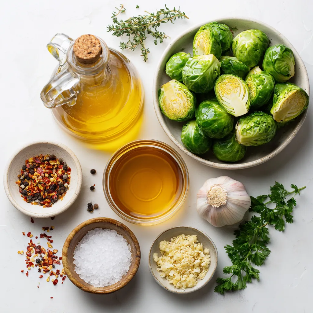 To make crispy honey garlic Brussels sprouts, start with fresh Brussels sprouts. Halve each one to help them cook evenly. The olive oil adds richness, while honey gives a sweet touch. Garlic brings in great flavor, and apple cider vinegar balances it out.