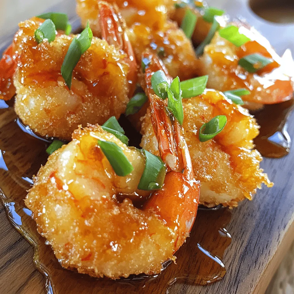 To make crispy honey garlic shrimp bites, you need: - 1 lb large shrimp, peeled and deveined - 1/2 cup all-purpose flour - 1/2 cup cornstarch - 1 teaspoon baking powder - 1 teaspoon garlic powder - 1 teaspoon onion powder - 1/2 teaspoon paprika - Salt and pepper to taste - 1 cup sparkling water (or regular water) - Oil for frying These ingredients create a light and crispy coating that perfectly hugs the shrimp. This sauce adds a sweet and savory kick. Gather these items: - 1/3 cup honey - 2 cloves garlic, minced - 2 tablespoons soy sauce - 1 tablespoon rice vinegar - 1 teaspoon sesame oil - 1/2 teaspoon red pepper flakes (optional) - Chopped green onions for garnish The garlic and honey blend beautifully, making the shrimp irresistible. If you need substitutes, here are some ideas: - Use shrimp with shells on for more flavor. - Swap cornstarch with potato starch for extra crunch. - Replace honey with maple syrup for a different sweetness. - Use lime juice instead of rice vinegar for a zesty twist. These swaps will keep the flavor strong while making it work for your needs. Start by patting the shrimp dry. Use paper towels to soak up any extra moisture. This step is key for getting that crispy texture. Wet shrimp will steam instead of fry. You want them nice and dry! In a large bowl, mix the dry ingredients. Combine 1/2 cup all-purpose flour, 1/2 cup cornstarch, 1 teaspoon baking powder, 1 teaspoon garlic powder, 1 teaspoon onion powder, and 1/2 teaspoon paprika. Add salt and pepper to taste. Slowly add 1 cup of sparkling water. Whisk until you have a smooth batter. It should look like pancake batter. Heat about 2 inches of oil in a deep skillet or pot. Aim for 350°F (175°C). To check if the oil is ready, drop a bit of batter in. It should sizzle and rise. Dip each shrimp in the batter, coating it well. Place them gently in the hot oil. Fry in batches to keep them from sticking together. Cook for 2-3 minutes on each side until golden brown. In a small saucepan, mix 1/3 cup honey, 2 minced garlic cloves, 2 tablespoons soy sauce, 1 tablespoon rice vinegar, and 1 teaspoon sesame oil. If you like heat, add 1/2 teaspoon red pepper flakes. Stir this over medium heat for about 3-4 minutes. You want the sauce warm and slightly thick. In a large bowl, toss the crispy shrimp with the honey garlic sauce. Make sure each piece is coated well. Transfer the shrimp to a serving platter. For a fresh touch, sprinkle chopped green onions on top. Enjoy your crispy honey garlic shrimp bites! To make shrimp extra crispy, start with dry shrimp. Use paper towels to pat them dry. This step helps the batter stick and fry well. Next, use a mix of flour and cornstarch. The cornstarch makes the shrimp crunchier. When making the batter, add sparkling water. The bubbles in the water create a light and crispy coating. Fry the shrimp in hot oil, around 350°F (175°C). Fry them in small batches to keep them from steaming. The right oil makes all the difference. Use oils with high smoke points, like canola or peanut oil. These oils can handle high heat without burning. They also give a nice flavor to the shrimp. Avoid olive oil for frying, as it burns easily. Get ready by prepping all ingredients first. Measure the flour, cornstarch, and spices ahead of time. This step makes cooking faster and smoother. If you want to save time, use store-bought honey garlic sauce. You can also prep the shrimp in advance. Just coat and fry them when you are ready to eat. {{image_2}} To add some heat, try spicy honey garlic shrimp bites. Start with the same shrimp and batter. For the sauce, increase the red pepper flakes to one teaspoon. You can also add a splash of sriracha or chili paste. This gives a nice kick to the dish. The sweet honey balances the heat well. Serve with lime wedges for extra flavor. No shrimp? No problem! You can make a vegetarian version using cauliflower or tofu. Cut cauliflower into bite-sized pieces or use firm tofu, cubed. Follow the same batter recipe and frying method. The honey garlic sauce works just as well on these veggies. This way, everyone can enjoy the flavor explosion. Get creative with sauces! Try a sweet chili sauce for a fruity twist. Or mix soy sauce with a touch of maple syrup for a new flavor. You can also make a garlic butter sauce for a rich taste. These sauces can change the whole dish. Experiment and find your favorite! To store leftover shrimp, first let them cool. Place the shrimp in an airtight container. You can keep them in the fridge for up to 2 days. Make sure to layer them with paper towels. This helps absorb moisture and keeps them crispy longer. When reheating shrimp, use the oven. Preheat it to 350°F (175°C). Spread the shrimp on a baking sheet. Heat for about 10 minutes until they are warm and crispy again. Avoid using the microwave. It may make the shrimp soggy. If you want to freeze shrimp, first cool them completely. Place them in a single layer on a baking sheet. Freeze for about 1 hour until solid. Then, transfer them into a freezer-safe bag. Remove as much air as possible. You can store them for up to 3 months. Thaw in the fridge before reheating. Yes, you can use frozen shrimp. Just make sure to thaw them first. Place them in the fridge overnight or run them under cold water. This will help them cook evenly. Pat them dry before coating to remove extra moisture. This step is key for crispiness. These shrimp bites pair well with many sides. Try serving them with: - Steamed rice - Fried rice - Noodles - Fresh salad - Vegetable stir-fry These options will enhance the meal and balance the flavors. Frying shrimp takes about 2-3 minutes per side. Look for a golden brown color. Cooking time may vary based on the size of your shrimp. Always monitor them closely to avoid overcooking. Yes, you can bake them! Preheat your oven to 400°F (200°C). Place the coated shrimp on a baking sheet lined with parchment paper. Spray them lightly with cooking oil. Bake for about 15-20 minutes