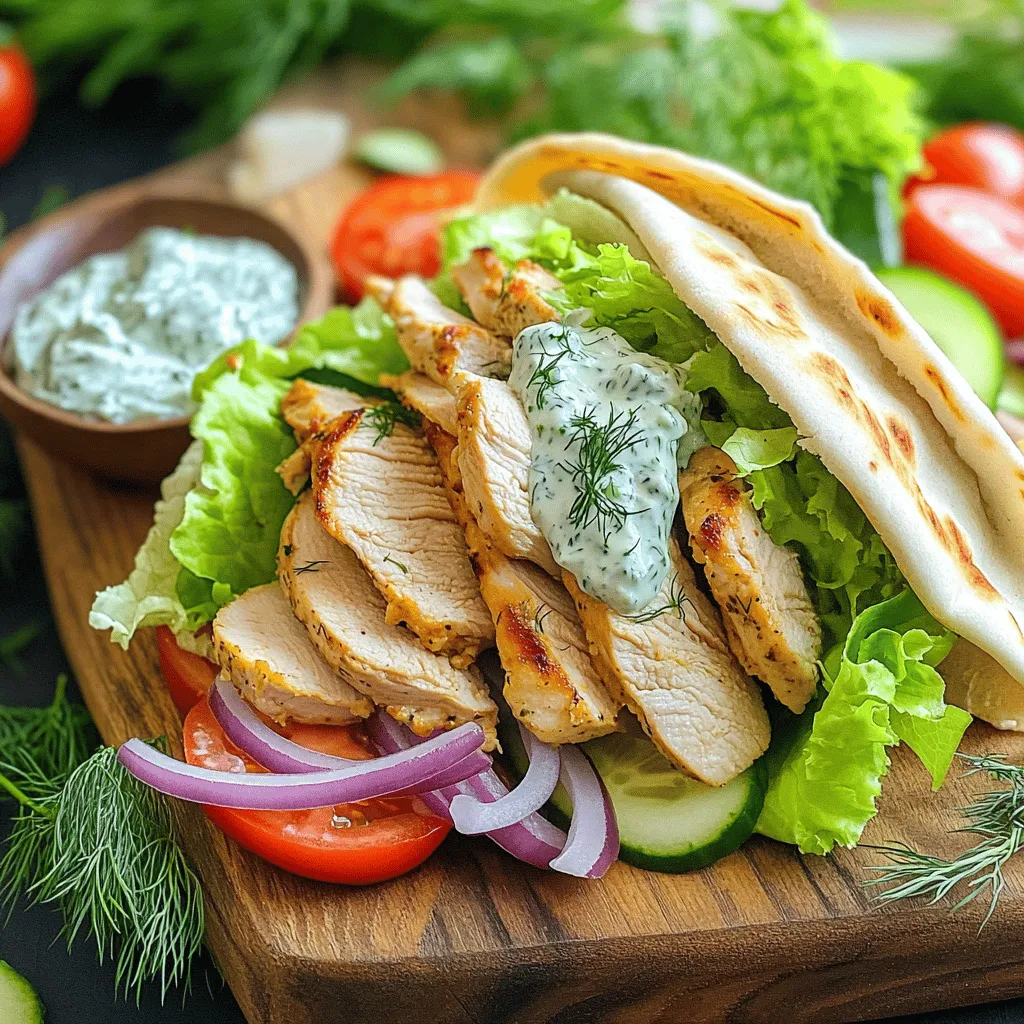 To make easy chicken gyros, you need some key items: - 500g chicken breast, thinly sliced - 2 tablespoons olive oil - 1 tablespoon lemon juice - 1 teaspoon garlic powder - 1 teaspoon onion powder - 1 teaspoon dried oregano - Salt and pepper to taste These ingredients bring flavor and zest to your gyros. The chicken breast serves as the main protein source, while olive oil and lemon juice add moisture and tang. Garlic and onion powders enhance the taste, and oregano gives a hint of earthiness. Don’t forget to season with salt and pepper for balance. For the refreshing tzatziki sauce, gather these simple ingredients: - 1 cup Greek yogurt - 1 cucumber, grated - 1 tablespoon fresh dill, chopped - Lemon juice This sauce is a must. Greek yogurt forms the base, giving it creaminess. The grated cucumber adds crunch, while fresh dill offers a burst of flavor. A squeeze of lemon juice brightens the sauce, making it perfect for your gyros. For serving, you’ll need: - 4 pita breads - Fresh veggies: tomatoes, red onion, lettuce, sliced Pita bread wraps around the filling, making it easy to hold. Fresh veggies add color and crunch. Using ripe tomatoes, crisp lettuce, and sharp red onions elevates your meal. These components make your chicken gyros not just tasty but also beautiful on the plate. For the full recipe, check out the details mentioned above. Enjoy your cooking! First, you need to mix the marinade. In a bowl, combine these ingredients: - 2 tablespoons olive oil - 1 tablespoon lemon juice - 1 teaspoon garlic powder - 1 teaspoon onion powder - 1 teaspoon dried oregano - Salt and pepper to taste Stir it well until the mixture is smooth. Next, add the thinly sliced chicken breast. Make sure each piece gets coated in the marinade. Cover the bowl with plastic wrap and let it sit in the fridge for 30 minutes. This helps the chicken soak up all the great flavors. While the chicken is marinating, we can whip up the tzatziki sauce. In a separate bowl, mix: - 1 cup Greek yogurt - 1 cucumber, grated - 1 tablespoon fresh dill, chopped - A pinch of salt - A squeeze of lemon juice Stir until everything is well combined. This sauce adds a creamy touch to your gyros. It’s cool, fresh, and full of flavor! After marinating, it’s time to cook the chicken. Heat a non-stick skillet or grill pan over medium-high heat. Cook the chicken for about 5-7 minutes. You want it to be fully cooked and slightly golden brown. Make sure to turn the pieces occasionally. This way, they cook evenly and get that nice color. Now comes the fun part—putting it all together! Warm the pita breads in a dry skillet for about 1 minute on each side. This makes them soft and easy to fold. To assemble, lay a warm pita flat. Spread a generous amount of tzatziki sauce on it. Then, add the cooked chicken on top. Don’t forget to add your fresh veggies like lettuce, tomatoes, and red onion. Finally, fold the pita in half and enjoy! For a complete guide, check out the Full Recipe. To save time when marinating chicken, use thin slices. Thin pieces soak up the flavor fast. You can also marinate the chicken overnight. This makes it even tastier. If you’re in a rush, try marinating for just 15 minutes. It still adds great flavor. To make tzatziki sauce thicker, start with good yogurt. Greek yogurt has the right texture. Grate the cucumber and squeeze out excess water. This helps keep the sauce from being runny. You can also add a bit of sour cream for extra creaminess. If you want more flavor, mix in some minced garlic or lemon zest. You can serve gyros in many fun ways. For a crowd, consider a gyro bar. Set out pita, chicken, tzatziki, and fresh veggies. Let everyone build their own! For something different, try using lettuce wraps instead of pita. You can also add unique toppings like feta cheese or olives. Mix and match for tasty variations! {{image_2}} You can switch the chicken for beef or lamb. Both meats bring rich flavors. If you want a lighter choice, try tofu or tempeh for a vegetarian dish. These options add unique tastes and textures to your gyros. You can also use chickpeas for a hearty, plant-based meal. If you need a gluten-free meal, skip the pita bread. Instead, use lettuce wraps. They hold all the tasty fillings well. You can also find gluten-free pita in stores. This way, everyone can enjoy gyros without worry. Spice blends can change your gyros’ taste. Try adding paprika for smoky notes. Cumin gives a warm and earthy flavor. You can also mix in chili powder for some heat. Experimenting with spices lets you find what you love best. Each blend makes your gyros special, and you can have fun with it! For the complete recipe, check out the Full Recipe section. To keep your chicken gyros fresh, store leftovers in an airtight container. Place the chicken and veggies separately from the pita and sauce. This prevents sogginess. Store everything in the fridge. They will last for up to three days. Make sure to cool the chicken before placing it in the fridge. When you reheat the chicken, aim to keep it juicy. You can use the microwave, but cover it with a damp paper towel. This helps retain moisture. Heat it for 30 seconds, then check. If it's not hot enough, keep heating in 15-second bursts. Another option is to use a skillet. Heat it on low with a splash of water. Cover it with a lid to steam the chicken gently. Tzatziki can stay fresh in the fridge for about four days. Store it in a sealed container to avoid contamination. If you notice any off smell or change in texture, it's best to toss it. You can also freeze tzatziki, but it may change in texture. To thaw, place it in the fridge overnight before using. Yes, you can prepare gyros in advance. This saves time for busy days. Here's how: - Marinate the chicken: You can marinate the chicken the night before. Store it in the fridge. - Make the tzatziki sauce: Prepare the sauce ahead of time. It tastes better after chilling for a few hours. - Chop veggies: Slice your tomatoes