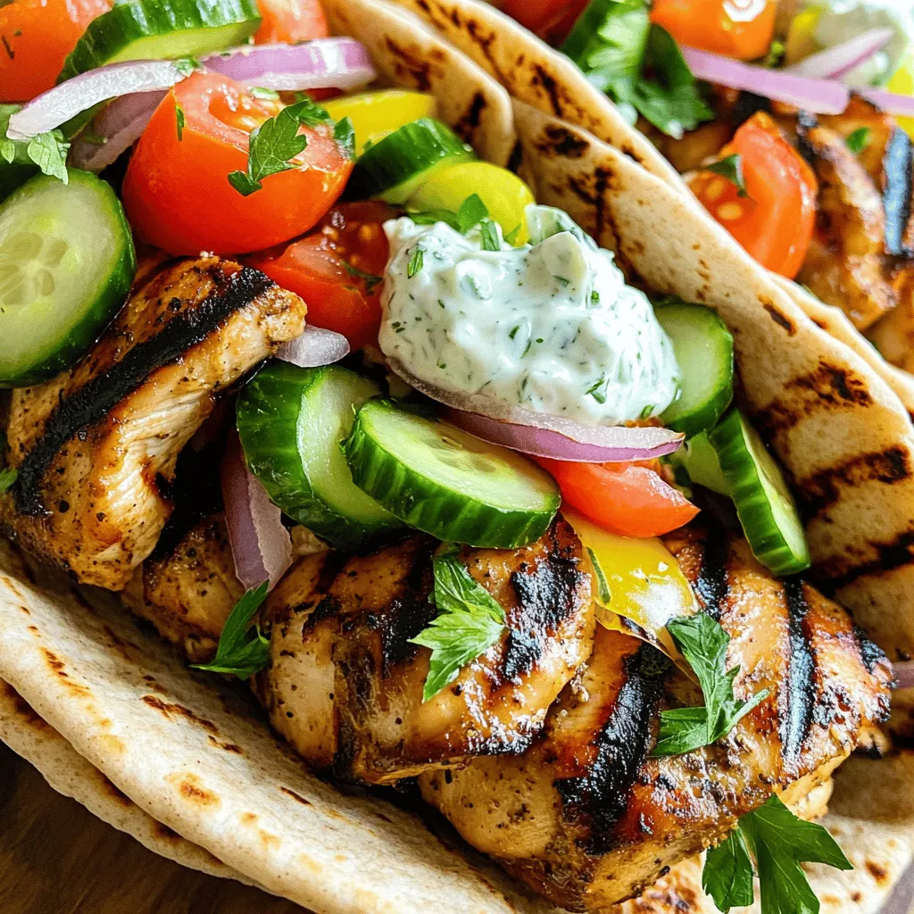 ![- 1 lb (450g) boneless chicken thighs - 3 tablespoons olive oil - 2 teaspoons dried oregano - 1 teaspoon garlic powder - 1 teaspoon smoked paprika - Salt and black pepper to taste - 4 whole wheat pitas or flatbreads - 1 cup tzatziki sauce (store-bought or homemade) - 1 cup diced tomatoes - 1 cup sliced cucumbers - 1/2 small red onion, thinly sliced - Fresh parsley for garnish The main ingredients for easy chicken gyros are simple yet full of flavor. I love using boneless chicken thighs because they stay juicy and tender. The marinade, made with olive oil, oregano, garlic powder, and smoked paprika, adds a kick. You can adjust the salt and pepper to your taste. For the perfect gyro, grab some whole wheat pitas. They hold all the goodness inside. Fresh vegetables bring crunch and brightness. Diced tomatoes, sliced cucumbers, and red onion give color and taste. Finally, a generous scoop of tzatziki sauce pulls it all together. This sauce cools the spices and adds creaminess. You can buy tzatziki or make your own. Either way, it’s a must for gyros. - Grill pan or skillet - Mixing bowl, knife, and cutting board To make these gyros, you will need a few simple tools. A grill pan or skillet cooks the chicken perfectly. If you don’t have a grill pan, a regular skillet works too. A mixing bowl helps you combine the marinade. You will also need a knife and cutting board for slicing the chicken and fresh veggies. These tools make the cooking process smooth and easy. For the full recipe, you can refer to the sections that follow. Enjoy the process of making these delightful chicken gyros! In a large bowl, combine olive oil, dried oregano, garlic powder, smoked paprika, salt, and black pepper. Stir well to mix all the spices. This mixture will give your chicken a rich flavor. Take the boneless chicken thighs and coat them in the marinade. Make sure every piece is covered. Let the chicken rest for at least 30 minutes. If you have more time, refrigerate it for up to 2 hours. This will enhance the flavor even more. Preheat a grill pan or skillet over medium-high heat. Once hot, add the marinated chicken thighs. Grill for 6-7 minutes on each side. Check the internal temperature; it should reach 165°F (75°C). You want nice grill marks and fully cooked chicken. After cooking, remove the chicken from the heat and let it rest for a few minutes. Slice the chicken into thin strips. Warm the whole wheat pitas on the grill for about 1-2 minutes. Then, layer the grilled chicken, tzatziki sauce, diced tomatoes, sliced cucumbers, and red onion in each pita. Garnish with fresh parsley. Wrap the pita around the fillings like a sandwich. Enjoy your easy chicken gyros! For the complete recipe, check out the Full Recipe. To make your chicken gyros shine, focus on the marinade. The basic mix gives great flavor, but you can add more spices to elevate your dish. Try adding: - Cumin for a warm, earthy taste. - Cinnamon for a hint of sweetness. - Lemon zest for freshness. These additions will make your chicken more exciting and tasty. Let the chicken marinate longer for deeper flavor, ideally two hours or more. You can cook chicken gyros in different ways. Each method brings a unique taste. Besides grilling, you can try: - Oven: Preheat to 400°F (200°C). Place chicken on a baking sheet for about 20 minutes. - Air fryer: Set it to 375°F (190°C) and cook for 15-20 minutes, flipping halfway. Both options will give you juicy chicken with a nice crust. Pair your gyros with tasty sides and drinks. Here are some ideas: - Sides: Greek salad, roasted potatoes, or a fresh tabbouleh. - Drinks: Try a light beer, lemonade, or sparkling water with mint. These pairings will balance your meal, making it more enjoyable. For the full recipe, check out the earlier sections! {{image_2}} You can change up this recipe by using different proteins. Lamb is a classic choice for gyros. It has a rich flavor that pairs well with the spices. Beef is another option. It gives a hearty taste. For a plant-based option, use tofu. Press it first to remove extra water. Then marinate it just like the chicken. This helps the tofu soak up flavors. Each protein brings its own twist to the dish. While tzatziki is a must for many, you can swap it for other sauces. Try hummus for a creamy touch. It adds a nice texture and flavor. You could also use garlic sauce or tahini. These options can give your gyros a unique spin. Experiment with different spreads to find what you like best. If you need gluten-free options, use lettuce wraps instead of pitas. This keeps all the flavors intact while being gluten-free. For low-carb diets, you can skip the pita and load up on veggies. Use extra cucumbers and tomatoes for crunch. These adjustments make the dish fit your needs without losing taste. For the full recipe, check out the detailed instructions above. To store your chicken gyros, first, let them cool. Then, place the gyros in a sealed container. You can keep them in the fridge for up to three days. If you store the chicken and veggies separately, they will last longer. Keep the tzatziki sauce in a different container. This will help maintain the freshness of each ingredient. When it's time to enjoy your leftovers, reheat carefully. The best way is to use a skillet. Heat it on medium for a few minutes. Add the chicken strips and warm them for about three minutes. This method keeps the chicken juicy and tasty. You can also wrap the gyros in foil and warm them in the oven at 350°F (175°C) for about 10 minutes. This way, they won't dry out. To freeze your gyros, start by cooling them completely. Wrap each gyro tightly in plastic wrap. Then, place them in a freezer bag. You can freeze them for up to three months. When you're ready to eat, thaw them in the fridge overnight. Reheat as described above for the best results. This way, you always have a quick meal ready! For the full recipe, check out the complete guide on making these Easy Chicken Gyros. To make tzatzik