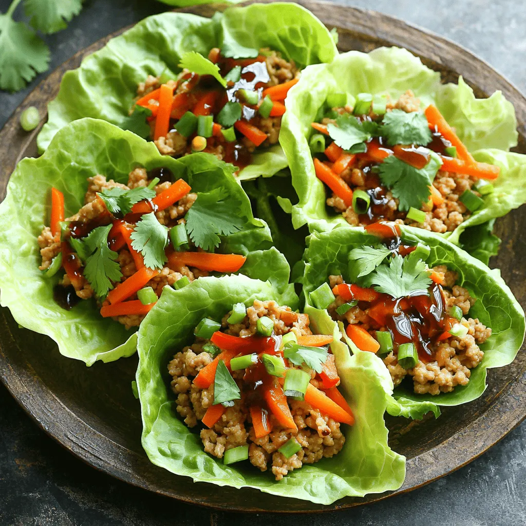 ![- 1 pound ground chicken - 1 tablespoon sesame oil - 2 cloves garlic, minced - 1 inch ginger, grated - 1 red bell pepper, diced - 1 cup carrots, julienned - 2 green onions, chopped - 1/4 cup soy sauce (low-sodium) - 1 tablespoon rice vinegar - 1 tablespoon hoisin sauce - 1 teaspoon chili garlic sauce (optional, for heat) - 1 head of Butter lettuce (or Romaine), leaves separated These ingredients create a simple yet tasty dish. Ground chicken gives protein and flavor. Sesame oil adds a nutty taste. Garlic and ginger bring warmth and depth. The veggies add crunch. Red bell pepper gives sweetness, while carrots offer a fresh bite. Green onions add bright flavor. The sauce mix of soy sauce, rice vinegar, hoisin sauce, and chili garlic sauce brings it all together. When choosing lettuce, I prefer Butter lettuce. Its soft leaves hold the filling well. Romaine is a great choice too. Both options make a fun wrap. For the full recipe, check out the details above. Enjoy making these easy chicken lettuce wraps! - Gather and prep all ingredients - Separate lettuce leaves First, gather all your ingredients. You will need ground chicken, sesame oil, garlic, ginger, red bell pepper, carrots, green onions, soy sauce, rice vinegar, hoisin sauce, and optional chili garlic sauce. This will make cooking much smoother. Next, separate the leaves of the butter lettuce. Choose the largest leaves for easy wrapping. Rinse them gently under cold water and pat them dry with a clean towel. Set these aside for later. - Heat oil and sauté garlic and ginger - Cook ground chicken until browned Now, heat the sesame oil in a large skillet over medium heat. Once hot, add the minced garlic and grated ginger. Sauté them for about 30 seconds. You want these to become fragrant, not browned. Then, add the ground chicken to the skillet. Cook it until it turns brown and no longer pink. This should take around 5 to 7 minutes. Make sure to break up the chicken as it cooks for even browning. - Mix in vegetables and sauce - Spoon into lettuce leaves and garnish After the chicken is cooked, stir in the diced red bell pepper and julienned carrots. Cook for another 3 to 4 minutes until the vegetables soften. In a small bowl, mix the soy sauce, rice vinegar, hoisin sauce, and optional chili garlic sauce. Pour this sauce over the chicken and vegetable mix. Stir until everything is well-coated. Remove the skillet from heat and fold in the chopped green onions. To serve, spoon the chicken mixture into your prepared lettuce leaves. Top each wrap with chopped cilantro for a fresh finish. For the full recipe, check the details above. Enjoy your Easy Chicken Lettuce Wraps! To get started, let's prep garlic and ginger right. For garlic, you should peel the cloves first. Then, chop them finely. This way, they blend well in the dish. For ginger, peel it using a spoon. Then, grate it with a box grater or microplane. This makes it easier to mix into the chicken. When it comes to diced vegetables, size matters! Aim for small, even pieces. For the red bell pepper, cut it into tiny cubes. The carrots should be julienned for a nice crunch. The green onions can be chopped thinly. Uniform sizes help everything cook evenly. Now, let's talk about cooking chicken. Start by heating your skillet to medium. Add sesame oil and wait until it shimmers. Then, add the ground chicken. Stir it often to brown nicely. This will give it great flavor. Don’t rush this step, as browning adds depth. For the vegetables, keep them crunchy! After adding the bell pepper and carrots, stir for just a few minutes. You want them to soften slightly but still have a bite. This contrast in texture makes the wraps exciting to eat. When it comes to serving, you can add rice or noodles on the side. This turns your wraps into a meal. If you want a lighter dish, keep it just as wraps. To make your meal more colorful, garnish with chopped cilantro. You can also drizzle some extra hoisin sauce on top for flair. This adds a nice touch and makes the dish pop! For the full recipe, check out the detailed instructions here. {{image_2}} You can easily adapt this recipe to fit your needs. For a gluten-free option, use tamari instead of soy sauce. This small swap keeps the flavor while making it safe for those avoiding gluten. If you want a low-carb dish, try using ground turkey instead of chicken. Turkey has a similar taste and works well in this wrap. Feel free to mix things up with different proteins. Ground turkey or even tofu can be great alternatives. They absorb flavors nicely. You can also play with spices and sauces. Add more chili garlic sauce for heat or try a splash of sriracha for a kick. This flexibility lets you create a dish that fits your taste. While Butter lettuce works great, you can use other greens. Romaine, for instance, adds a nice crunch. You can also experiment with collard greens or even cabbage for a unique twist. These options not only change the flavor but also add different textures to your wraps. Enjoy being creative with your wraps! For a full recipe, check out [Full Recipe]. After you make your Easy Chicken Lettuce Wraps, store the chicken mixture in an airtight container. This keeps it fresh and safe. Let it cool before sealing to avoid moisture buildup. For the lettuce, keep the leaves in a separate container. Wrap them in a damp paper towel to retain some moisture, then place them in a sealed bag. When it's time to enjoy your leftovers, use the stove or microwave. For the stove, heat on low until warm. This keeps the chicken juicy. If using the microwave, heat in short bursts to prevent drying out. To keep the lettuce crisp, don’t reheat it. Serve fresh leaves with the warm chicken mixture. These wraps can last in the fridge for about three days. After that, they may lose flavor or texture. Signs that your wraps have gone bad include a sour smell or discoloration. If you notice these changes, it’s best to toss them out. Enjoy your wraps fresh for the bes