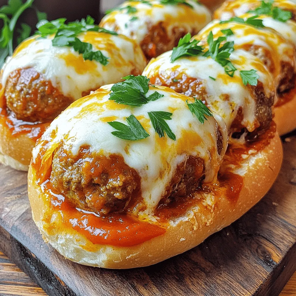 - 1 lb ground beef - 1/2 lb ground pork - 1/2 cup breadcrumbs - 1/4 cup grated Parmesan cheese - 1/4 cup fresh parsley, chopped - 2 cloves garlic, minced - 1/2 teaspoon onion powder - 1 teaspoon Italian seasoning - Salt and pepper to taste - 1 jar (24 oz) marinara sauce - 4 sub rolls - 1 cup mozzarella cheese, shredded - Olive oil for greasing The main proteins in this recipe are ground beef and ground pork. Using both gives you a rich flavor and nice texture. Next, breadcrumbs help bind the meat together and add a bit of crunch. Parmesan cheese adds a salty bite that enhances the overall taste. Garlic brings depth, while Italian seasoning gives the meatballs a classic Italian flavor. Don't forget to season with salt and pepper to bring all the flavors together. - Fresh herbs and spices - Different cheese varieties - Alternative bread options For extra flavor, consider adding fresh herbs like basil or oregano. You can also try different cheese types, such as provolone or cheddar. If you want to switch it up, use garlic bread or ciabatta rolls instead of standard sub rolls for a fun twist. - Mixing bowl and baking sheet - Saucepan for heating sauce - Oven for baking subs To make these subs, you need a few simple tools. A mixing bowl is essential for combining the ingredients. A baking sheet will hold the meatballs as they cook. You’ll also need a saucepan to heat the marinara sauce. Finally, your oven will be key for baking the meatball subs to perfection. You can find the full recipe [here](#). To make meatballs, you need to mix the ingredients well. In a big bowl, combine: - 1 lb ground beef - 1/2 lb ground pork - 1/2 cup breadcrumbs - 1/4 cup grated Parmesan cheese - 1/4 cup fresh parsley, chopped - 2 cloves garlic, minced - 1/2 teaspoon onion powder - 1 teaspoon Italian seasoning - Salt and pepper to taste Use your hands to mix everything. Be gentle. You want the meat to stay tender. After mixing, roll the mixture into small meatballs. Aim for 1 to 1.5 inches in size. Place them on a baking sheet. Next, preheat your oven to 375°F (190°C). This step is key. A hot oven helps the meatballs cook evenly. Bake the meatballs for 20 to 25 minutes. They should turn golden brown and be fully cooked. While the meatballs bake, prepare the sub rolls. Cut them in half lengthwise, but don’t cut all the way. Place them on a lined baking sheet. Once the meatballs are done, heat a jar of marinara sauce in a pan. Add the meatballs to the sauce. Let them simmer for 5 to 10 minutes. This step adds great flavor. Now, it’s time to fill the subs. Spoon 3 to 4 meatballs, along with some sauce, into each roll. Top each sub with shredded mozzarella cheese. You can use about 1 cup total for all the subs. Finally, place the assembled subs back in the oven for 5 to 7 minutes. You want the cheese to melt and bubble. After that, they are ready to enjoy! To make great meatballs, avoid overworking the meat mixture. When you mix, do it gently. If you press too hard, the meatballs can turn tough. This will help keep them juicy. Browning your meatballs adds flavor. You can sear them in a hot pan with a bit of oil before baking. This step gives a nice crust and deep taste. Remember, a good crust means more flavor in your subs. When it comes to cheese, mozzarella is the best choice for melting. It gets all stretchy and gooey. You can also mix in provolone for a twist. Both work well in your meatball subs. Bake your assembled subs for about 5-7 minutes. This time allows the cheese to melt perfectly without burning. Keep an eye on them to catch that golden-brown color. Presentation matters! Serve your meatball subs on a wooden board. Garnish with fresh parsley for a pop of color. This makes them look fancy and appetizing. Pair your subs with a side salad or some crispy chips. A cold drink like soda or iced tea complements the meal well. Enjoy your tasty creation and share it with friends! For the full recipe, check out the Full Recipe. {{image_2}} You can switch up the meatballs to suit your taste. Turkey and chicken meatballs are great for a lighter meal. They have a nice flavor and are lower in fat. If you want a plant-based option, try vegetarian meatballs made from lentils or beans. They add a unique twist. For flavor, you can mix in some herbs. Try adding basil or oregano for a fresh taste. You can also use different spices like cumin for a kick. Experiment with cheese, too! Mixing in feta or cheddar can change the whole vibe of your subs. You don’t have to stick with marinara sauce. You can make your own at home or grab a jar from the store. Homemade sauce tastes fresh and lets you control the flavor. If you're short on time, a good store-bought sauce works just fine. Other sauce choices can really jazz up your meatball sub. Alfredo sauce gives a creamy touch, while pesto adds a herby flavor. You can even try barbecue sauce for a smoky taste. The options are endless! The bread you choose makes a big difference. Classic sub rolls are soft and hold the meatballs well. You can use hoagie rolls or baguettes for a crunchier bite. If you need gluten-free options, look for gluten-free sub rolls at your local store. You can also use lettuce wraps for a low-carb choice. Just be sure to layer your meatballs carefully so everything stays together. For the full recipe, check out the Easy Meatball Subs section above! To keep your meatball subs fresh, wrap them in foil or plastic wrap. This practice helps keep moisture in and prevents them from drying out. You can store them in the fridge for up to three days. If you want to enjoy them later, freezing is a great option. You can freeze your assembled subs for quick meals later. Just wrap each sub tightly in plastic wrap and then in aluminum foil. This double layer protects them from freezer burn. They can last in the freezer for up to three months. When you're ready to eat, simply thaw them in the fridge overnight. When reheating, you have a couple of choices. The microwave