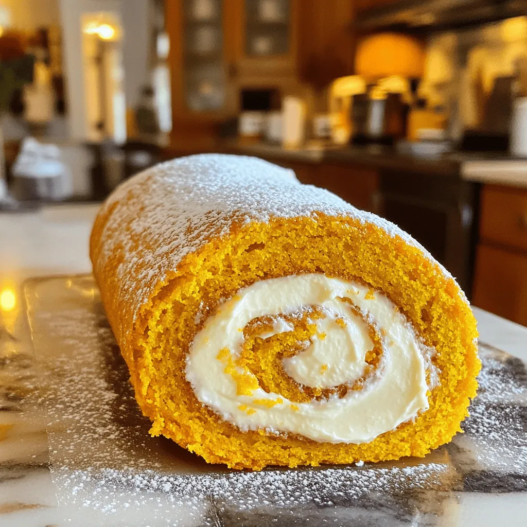 ![To make the easy pumpkin roll cake, you will need: - 3/4 cup all-purpose flour - 1 teaspoon baking powder - 1/2 teaspoon baking soda - 1/2 teaspoon ground cinnamon - 1/4 teaspoon ground nutmeg - 1/4 teaspoon ground ginger - 1/4 teaspoon salt - 3 large eggs - 1 cup granulated sugar - 1 cup canned pumpkin puree - 1 teaspoon vanilla extract - Powdered sugar for dusting For the filling: - 8 oz cream cheese, softened - 1/4 cup unsalted butter, softened - 1 cup powdered sugar - 1 teaspoon vanilla extract Here’s a quick guide for measuring your ingredients: - 3/4 cup all-purpose flour = 95 grams - 1 teaspoon baking powder = 5 grams - 1/2 teaspoon baking soda = 2 grams - 1/2 teaspoon ground cinnamon = 1.5 grams - 1/4 teaspoon ground nutmeg = 0.5 grams - 1/4 teaspoon ground ginger = 0.5 grams - 1/4 teaspoon salt = 1.5 grams - 3 large eggs = 150 grams (about 50 grams each) - 1 cup granulated sugar = 200 grams - 1 cup canned pumpkin puree = 240 grams - 1 teaspoon vanilla extract = 5 ml - 8 oz cream cheese = 226 grams - 1/4 cup unsalted butter = 57 grams - 1 cup powdered sugar = 120 grams If you need to substitute, here are some ideas: - Use whole wheat flour for a healthier option. - Applesauce can replace some or all of the eggs. - Maple syrup can substitute for granulated sugar for natural sweetness. - If you're dairy-free, try a non-dairy cream cheese for the filling. - You can use pumpkin pie spice instead of individual spices for convenience. Check out the Full Recipe for details on making your pumpkin roll cake. First, preheat your oven to 375°F (190°C). Grab a 15x10-inch jelly roll pan. Line it with parchment paper and lightly grease it. This helps the cake come out easily after baking. In a medium bowl, sift together the dry ingredients. This includes flour, baking powder, baking soda, cinnamon, nutmeg, ginger, and salt. In a larger bowl, beat the eggs and granulated sugar together for about 3-4 minutes. The mix should look pale and fluffy. Next, mix in the pumpkin puree and vanilla extract until combined. Now, slowly add the dry mix to the pumpkin mixture. Stir gently until just combined. Pour the batter into the prepared pan. Spread it evenly using a spatula. Bake for 13-15 minutes. The cake should spring back when touched. Once baked, dust the hot cake with powdered sugar. Place a clean kitchen towel on top and flip the cake onto the towel. Gently peel away the parchment paper. Start rolling the cake from one edge of the towel. Keep it tight and let it cool completely in this rolled shape. These steps will help you create a perfect pumpkin roll cake. For the complete recipe, check out the Full Recipe. To get the right cake texture, focus on mixing. When you beat the eggs and sugar, do it well. This adds air and helps the cake rise. The batter should be smooth and slightly thick. Don't overmix once you add the dry ingredients. Stir until just combined to keep it light and fluffy. One common mistake is not preheating the oven. Always set the oven to 375°F before you start. Another error is letting the cake cool too long in the pan. Roll it right after baking for the best shape. Lastly, don't skip the powdered sugar dusting. It keeps the cake from sticking to the towel. Using the right tools makes this recipe easier. Here’s what you need: - A 15x10-inch jelly roll pan - Parchment paper to line the pan - An electric mixer for beating the eggs and filling - A clean kitchen towel for rolling - A sifter for the dry ingredients These tools help you create a perfect pumpkin roll. Don't forget to check the [Full Recipe] for more details! {{image_2}} You can easily switch up the flavor of your pumpkin roll cake. Adding spices can bring new life to this recipe. Try these options: - Cocoa Powder: For a chocolate twist, mix in 1/4 cup of cocoa powder. - Ginger: Increase the ginger to 1/2 teaspoon for a spicier kick. - Nutmeg: Up the nutmeg to 1/2 teaspoon for a warm flavor boost. These small tweaks can make a big difference. You can also add nuts like walnuts or pecans for extra crunch. Just chop them finely and blend them into the batter. If you need to adjust the recipe for dietary needs, there are simple swaps. Here are some ideas: - Gluten-Free: Use a gluten-free flour blend instead of all-purpose flour. This keeps the cake moist. - Vegan: Substitute the eggs with 1/4 cup of unsweetened applesauce for each egg. Use vegan cream cheese for the filling. These options let anyone enjoy the delicious pumpkin roll cake. Presentation matters when serving your pumpkin roll cake. Here are some fun ways to make it pop: - Dust with Powdered Sugar: A light dusting of powdered sugar adds a touch of elegance. - Add Whipped Cream: Serve slices with a dollop of whipped cream for a treat. - Garnish with Nuts: Sprinkle chopped nuts on top for a crunchy finish. These simple ideas can turn your cake into a show-stopping dessert. Check out the Full Recipe for more details. To store leftover pumpkin roll cake, wrap it tightly in plastic wrap. This keeps the cake moist and fresh. You can also place it in an airtight container. Make sure the cake cools completely before wrapping or storing. This helps prevent any sogginess. If you want to freeze the pumpkin roll cake, wrap it in plastic wrap first. Then add a layer of aluminum foil for extra protection. You can freeze it for up to three months. When ready to eat, thaw it in the fridge overnight. This method helps maintain its flavor and texture. The pumpkin roll cake stays fresh in the fridge for about 5 days. Always check for any signs of spoilage before eating. If it looks or smells off, it's best to throw it away. To enjoy it at its best, serve it chilled. For more detailed cooking methods, check the Full Recipe. Yes, you can make the pumpkin roll cake ahead of time. This cake keeps well in the fridge for a few days. Just wrap it tightly in plastic wrap to keep it fresh. For best results, fill the cake a day before serving. This allows the flavors to meld toge