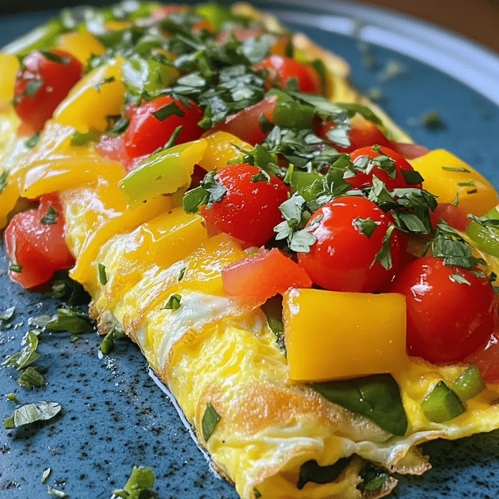 - Eggs and dairy components: Start with 3 large eggs. They give the omelette its structure. Add 2 tablespoons of milk for creaminess. You can use any milk you like. - Recommended vegetables: Choose a mix of colorful veggies. I like using: - 1/4 cup diced bell peppers (red, yellow, and green) - 1/4 cup finely chopped red onion - 1/4 cup halved cherry tomatoes - 1/4 cup chopped spinach These add flavor and a nice crunch. - Optional herbs and seasonings: For extra taste, add salt and pepper to your eggs. You can garnish with fresh herbs like parsley or chives. These add a fresh touch and visual appeal. Using these ingredients, you can create a tasty and healthy meal. Make sure to check the [Full Recipe] for all the details! Whisking the egg mixture Start by cracking three large eggs into a mixing bowl. Add 2 tablespoons of milk for creaminess. Use a whisk to blend until the mix is frothy. Add a pinch of salt and pepper for flavor. This step is key for a fluffy omelette. Sautéing the vegetables Next, heat 1 tablespoon of olive oil or butter in a non-stick skillet over medium heat. Once hot, add 1/4 cup of diced bell peppers and 1/4 cup of red onion. Sauté for about 2-3 minutes until they soften. Then, add 1/4 cup of halved cherry tomatoes and 1/4 cup of chopped spinach. Cook for another 2 minutes until the spinach wilts. The colors and smells will make your kitchen come alive. Cooking the omelette Now, pour the egg mixture into the skillet. Swirl it around so the veggies spread evenly. Cook for about 3-4 minutes. Watch for the edges to lift from the pan. When the eggs are nearly set but still a bit runny on top, sprinkle 1/4 cup of shredded cheddar cheese on one half. Use a spatula to fold the omelette in half, covering the cheese. Cook for another minute to melt the cheese. Finally, slide the omelette onto a plate and garnish with fresh herbs. Importance of using a non-stick skillet Using a non-stick skillet is crucial. It helps the omelette slide out easily without burning. This means less mess and more time to enjoy your meal. Tips for folding the omelette When folding, do it gently. This keeps the filling inside and ensures a nice presentation. Use a spatula to lift the edge and fold it over without breaking it. Practice makes perfect! To make the best veggie omelette, you need to know the right cooking temperatures. I recommend using medium heat. This heat cooks the eggs without burning them. If the heat is too high, the eggs can become tough. If it's too low, they can turn out runny. Common mistakes can ruin your omelette. One mistake is overcooking. Keep an eye on the eggs. They should be set but still a bit soft on top. Another mistake is not using the right pan. A non-stick skillet helps the omelette slide out easily. Make sure to add oil or butter to avoid sticking. Spices can bring your omelette to life. I suggest using black pepper, paprika, or even a pinch of cayenne for some heat. Fresh herbs like parsley or chives add a nice touch, too. Seasoning is key to a great omelette. Don't skip the salt. A little salt enhances the flavors of the eggs and veggies. Taste as you go. You can always add more, but you can't take it out once it's in. For a detailed recipe to get started, check the Full Recipe. {{image_2}} You can easily switch out the cheese in your veggie omelette. Here are some tasty choices: - Feta cheese adds a nice tang. - Goat cheese brings a creamy texture. - Mozzarella melts beautifully and is mild. You can also try different veggies. Here are a few options: - Mushrooms give a savory depth. - Zucchini adds a fresh crunch. - Broccoli is packed with nutrients and flavor. If you want a vegan omelette, try using plant-based egg alternatives. Here are some popular choices: - Chickpea flour makes a fluffy base. - Silken tofu blends well for a creamy texture. For cheese, use non-dairy substitutes like: - Nutritional yeast adds a cheesy flavor. - Cashew cheese gives creaminess without dairy. These swaps keep your omelette delicious and cater to different diets. For the full recipe, check out the Colorful Veggie Delight Omelette. To keep your veggie omelette fresh, you need to store it right. First, let the omelette cool down. This helps prevent moisture build-up. Next, wrap it in plastic wrap or place it in an airtight container. This keeps out air and moisture. You can keep it in the fridge for up to three days. When you're ready to eat, just reheat it in a skillet or microwave until hot. This method helps keep the flavors intact. If you want to save your omelette for later, freezing works well. Start by letting the omelette cool completely. Then, wrap it tightly in plastic wrap. After that, place it in a freezer bag or container. Make sure to remove as much air as possible. You can freeze the omelette for up to one month. When you're ready to eat, thaw it overnight in the fridge. Reheat it gently in a skillet or microwave. This keeps the texture nice and fluffy. For more details, check out the Full Recipe. To stop your omelette from sticking, always use a non-stick skillet. This type of pan helps the omelette slide out easily. Before you pour in the eggs, heat the skillet on medium heat. Add some olive oil or butter and let it warm up. Swirl the fat around to coat the pan. Once it’s hot, add your veggies. Then, pour in the egg mix. This method really helps! Yes, you can prep your omelette in advance! You can chop the veggies and mix the eggs a few hours ahead. Store the veggies and egg mix in separate containers in the fridge. When you are ready to eat, just heat the skillet and cook it fresh. This keeps the flavors bright and tasty. You can tell your omelette is done by checking the edges. They should lift slightly from the pan. The center should still be a bit soft, but not runny. When you fold it over, the cheese should melt inside. If it looks golden brown and puffs up a little, it’s ready to eat. Enjoy your colorful veggie delight! For the full recipe, check out t