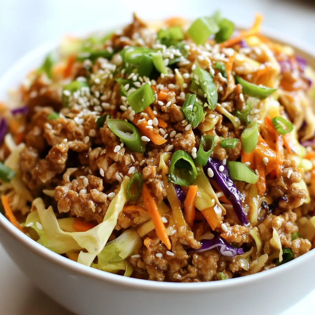 Egg Roll in a Bowl is a fun, deconstructed version of a classic egg roll. It has all the great flavors without the need for the wrapper. The main parts are ground chicken or turkey, coleslaw mix, and a mix of tasty sauces. The dish is quick to make and packed with veggies. You can enjoy this dish warm, topped with sesame seeds for a little crunch.