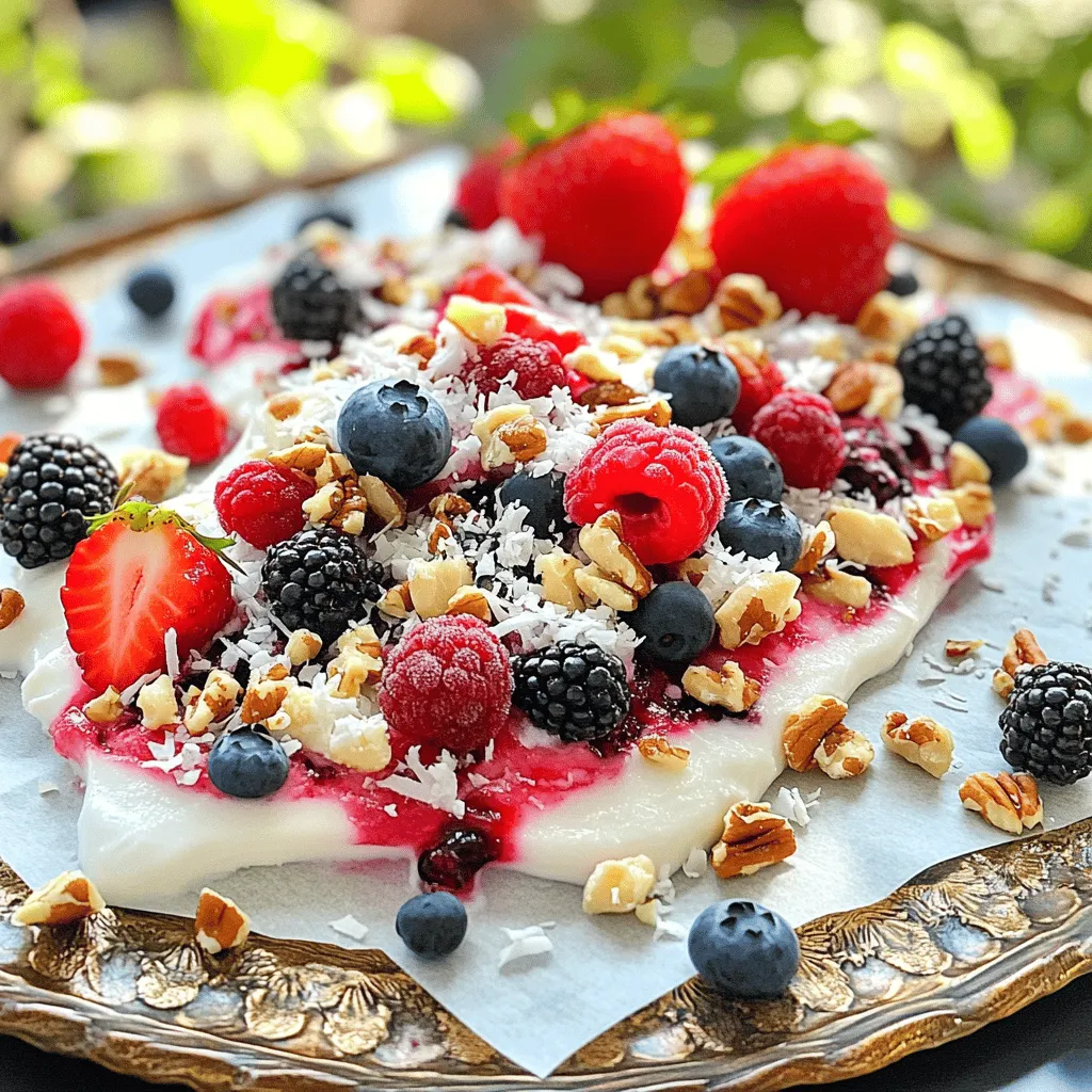 - 2 cups plain Greek yogurt - 2 tablespoons honey or maple syrup - 1 teaspoon vanilla extract - 1 cup mixed berries (strawberries, blueberries, raspberries, and blackberries) Frozen yogurt bark is simple to make. The main ingredients are Greek yogurt, sweeteners, and berries. Greek yogurt gives the bark creaminess and protein. Honey or maple syrup adds a touch of sweetness. Vanilla extract boosts the flavor. The mixed berries provide a burst of freshness. You can use any berries you like for this treat. - 1/4 cup chopped nuts (almonds or walnuts) - 2 tablespoons shredded coconut (unsweetened, optional) You can make your yogurt bark even better with add-ins. Chopped nuts add crunch and healthy fats. Almonds or walnuts work great. Shredded coconut lends a tropical flair. Use unsweetened coconut for a less sweet taste. You can also add a splash of vanilla extract for more flavor. - Serve on a decorative platter - Garnish with fresh berries For a beautiful presentation, serve the bark on a nice platter. You can add fresh berries on top for a pop of color. This treat pairs well with other desserts. Try serving it alongside chocolate or fruit sorbet. You can also enjoy it as a snack or a light dessert. For the complete recipe, check out the [Full Recipe]. Start by mixing the yogurt and sweetener. In a bowl, add 2 cups of plain Greek yogurt. Then, stir in 2 tablespoons of honey or maple syrup. Add 1 teaspoon of vanilla extract for flavor. Mix until it’s smooth and creamy. This yogurt base is the heart of your bark. Next, prepare the baking sheet. Line a baking sheet with parchment paper. This will help you remove the yogurt bark easily once it’s frozen. Make sure the paper covers the entire sheet to prevent sticking. Now it’s time to spread the yogurt mixture. Pour the creamy yogurt onto the lined baking sheet. Use a spatula to spread it evenly. Aim for about 1/2 inch thick. This thickness helps it freeze well. With the yogurt spread, add your toppings. Sprinkle 1 cup of mixed berries over the yogurt layer. Use strawberries, blueberries, raspberries, and blackberries for a colorful mix. Gently press the berries into the yogurt. This keeps them from falling off later. Now, add 1/4 cup of chopped nuts and 2 tablespoons of shredded coconut for extra flavor. Place the baking sheet in the freezer. Freeze the yogurt bark for at least 3-4 hours. You want it to be completely firm before serving. Once frozen, take it out and break it into pieces. You can use a sharp knife or just break it apart with your hands. This gives a rustic look to your bark. Store any leftover pieces in an airtight container in the freezer. Enjoy your frozen yogurt bark anytime! For the complete recipe, check out the [Full Recipe]. To get the best texture, start with thick Greek yogurt. This keeps the bark from becoming too watery. Mix in your sweetener well. If you want a creamier texture, try full-fat yogurt. After mixing, spread the yogurt evenly on the baking sheet. Aim for about half an inch thick. This thickness helps it freeze nicely. For freezing times, leave it in the freezer for at least 3-4 hours. The longer it freezes, the firmer it gets. You can use flavored yogurt to add more taste. Try vanilla, strawberry, or blueberry yogurt. These flavors mix well with the berries. You can also mix toppings for fun. Add different berries like strawberries, blueberries, or even kiwi. For a crunch, sprinkle on nuts like almonds or walnuts. Shredded coconut can add sweetness and texture too. This makes each bite more exciting. Serve the yogurt bark right from the freezer. It tastes best when it’s very cold. Cut it into pieces for easy eating. For a fun twist, use cookie cutters for fun shapes. Serve it on a nice platter, and add a few fresh berries on top. This makes the dish look great and adds color. You can also pair it with a scoop of ice cream for a treat. {{image_2}} Using seasonal berries is a great way to boost flavor. Fresh strawberries, blueberries, and raspberries shine in this treat. When berries are in season, their taste is brighter and sweeter. You can also substitute with other fruits. Try sliced bananas, diced peaches, or even mango. Just make sure to cut them small. This keeps the bark easy to eat and fun to enjoy. If you need dairy-free options, there are great substitutes. Use coconut yogurt or almond yogurt in place of Greek yogurt. These alternatives still offer a creamy texture. You can also switch out sweeteners. Instead of honey, use agave syrup or stevia. Both options work well and keep the bark sweet. For holiday themes, you can get creative! Add festive colors like red and green for Christmas. You could use blueberries and strawberries for a July 4th celebration. Customizing for parties is fun too. You could cut the bark into fun shapes using cookie cutters. This makes your dessert stand out on any table. To keep your frozen yogurt bark fresh, use airtight containers. This prevents ice crystals from forming, which can change the texture. Store your bark in the freezer, and it will last for about two to three weeks. If you want to enjoy it longer, wrap it tightly in plastic wrap before placing it in a container. You can refreeze frozen yogurt bark, but it may lose some texture and flavor. If you must, try to keep the bark in a single layer. This helps maintain its structure. When you refreeze, make sure to use an airtight container again to avoid freezer burn. To safely thaw your frozen yogurt bark, take it out of the freezer and let it sit at room temperature for about 10 to 15 minutes. If you want to enjoy it cold, just break off a piece and eat it right away! To keep the texture nice, avoid using a microwave, as it can make the bark too soft. Enjoy your treat fresh for the best flavor and crunch! Frozen yogurt bark is a fun and tasty treat. It combines yogurt, sweeteners, and toppings. You spread yogurt on a baking sheet, add fruits and nuts, then freeze it. After freezing, you break the yogurt