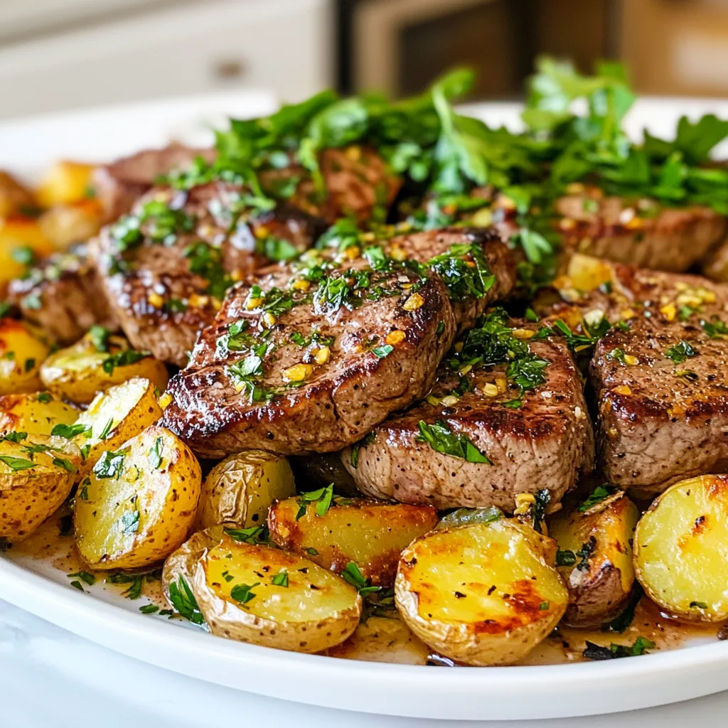 A delicious skillet dish featuring tender steak and crispy baby potatoes, all coated in a rich garlic butter sauce.