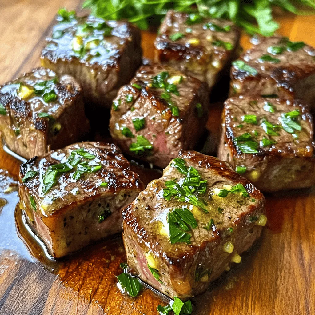 To make Garlic Butter Steak Bites, you need a few simple ingredients. Each one adds a special touch to the dish. Here's what you'll need: - 1 lb sirloin steak, cut into bite-sized cubes - 4 tablespoons unsalted butter - 4 cloves garlic, minced - 1 teaspoon fresh thyme leaves - 1 teaspoon fresh rosemary, chopped - Salt and black pepper to taste - 1 tablespoon olive oil - Fresh parsley, chopped (for garnish) 1. Sirloin steak: This cut is tender and full of flavor. It cooks well and gives a nice bite. 2. Unsalted butter: This adds richness and a creamy taste. It helps the garlic flavor shine. 3. Garlic: Fresh garlic gives a strong, savory taste. It brings warmth to the dish. 4. Fresh herbs (thyme and rosemary): These herbs add freshness and a lovely aroma. They complement the steak well. 5. Olive oil: It helps sear the steak. It adds a subtle fruitiness to the dish. 6. Salt and pepper: These are essential for seasoning. They enhance all the flavors in the meal. 7. Garnish options: Fresh parsley adds a pop of color and freshness to the final dish. With these ingredients, you can make a delicious meal in no time. Check out the Full Recipe for all the steps to create this tasty dish! First, season the steak bites with salt and black pepper. Use enough seasoning to coat each piece well. This step adds flavor right from the start. Let the steak rest for about 10 minutes at room temperature. This helps the meat stay tender during cooking. Now, heat a large skillet over medium-high heat. Add olive oil and let it shimmer. This indicates the pan is ready. Carefully place the seasoned steak bites in a single layer. Avoid crowding the pan, as this will steam the meat. Sear the steak bites for about 3-4 minutes. Turn them occasionally to brown all sides, but do not overcook. Remove the steak bites from the pan and set them aside. In the same skillet, reduce the heat to medium. Add the unsalted butter and let it melt. Once melted, stir in the minced garlic, fresh thyme, and rosemary. Sauté for 1-2 minutes, until the garlic becomes fragrant and lightly golden. This garlic butter is what makes the dish special. Return the seared steak bites to the skillet. Toss them in the garlic butter mixture for about 1 minute. Make sure each piece is well coated. Be careful not to overcook the meat at this stage. Finally, remove the skillet from the heat. Garnish the steak bites with freshly chopped parsley before serving. This adds a nice touch to your dish. You can find the full recipe for Garlic Butter Steak Bites [here]. For steak bites, I recommend using sirloin. It is tender and has great flavor. You can also try ribeye for a richer taste. Look for cuts with some marbling. This fat adds juiciness and flavor. When selecting meat, check the color. It should be bright red. Avoid any meat that looks dull or brown. Fresh steak will have a nice, firm texture, too. To get perfect searing, heat your pan well. I like to use a cast iron skillet for this. Add a little oil and let it shimmer before adding the steak. This helps create a nice crust. Cook the steak bites in batches. This keeps the heat high and the meat tender. Turn them only a few times. Sear for about 3-4 minutes but do not overcook. Remove the bites as soon as they are browned to keep them juicy. Pair your steak bites with simple sides. A fresh salad or roasted veggies works well. For a fun twist, try serving them in warm tortillas. You can also add a side of dipping sauce. For plating, arrange the steak bites neatly on a plate. Drizzle some garlic butter on top. Garnish with fresh parsley for a pop of color. This makes the dish look as good as it tastes. For the full recipe, check out the details above. {{image_2}} You can switch up the meat for your garlic butter steak bites. Some great options include: - Ribeye steak - Filet mignon - Flank steak These cuts will give you different flavors and textures. If you want a dairy-free option, use olive oil instead of butter. You can also try vegan butters made from plants. Want to spice things up? Add herbs and spices for extra flavor. Some ideas include: - Oregano - Paprika - Chili flakes You can also add sauces or marinades to the steak bites. A splash of soy sauce, Worcestershire sauce, or balsamic vinegar can bring new depth to the dish. You can enjoy garlic butter steak bites in many ways. Serve them as an appetizer at parties or as a main dish for dinner. They are great on their own or paired with sides like: - Mashed potatoes - Steamed veggies - Rice If you want to get creative, try putting the steak bites in wraps or tacos. This adds a fun twist and makes it easy to share. Explore these variations to find your favorite way to enjoy this tasty dish. For the full recipe, check out the recipe section! To store your garlic butter steak bites, let them cool first. Place them in an airtight container. Make sure to separate layers with parchment paper. This keeps the bites from sticking together. How long do steak bites last? They last about three days in the fridge. If you want them to last longer, freeze them. In the freezer, they stay good for up to three months. When reheating steak bites, you want to keep them juicy. The best way is to use a skillet. Heat the skillet on low. Add a small amount of butter to keep them moist. You can also heat them in the microwave. Use a microwave-safe dish and cover it with a damp paper towel. This helps trap steam and keeps your steak bites tender. For ideal temperatures, aim for 130°F to 140°F. This keeps the meat warm without cooking it more. Enjoy your tasty bites just like they were fresh! To make garlic butter steak bites tender, choose the right cooking method. Searing the steak quickly helps lock in moisture. Use high heat for a short time. This method gives you a nice crust while keeping the inside juicy. Let the steak rest after cooking to allow the juices to settle. This step is key to tenderness. Yes, you can use frozen steak for this recipe. However, there ar