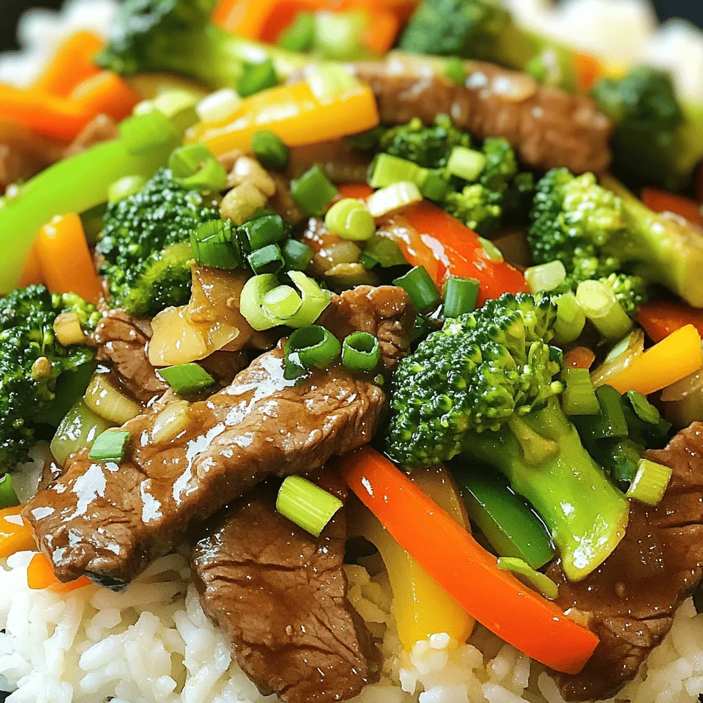 Return the cooked beef to the skillet with the veggies. Drizzle sesame oil over the stir-fry. Toss everything together for another minute. This helps blend all the flavors. Serve your garlic ginger beef stir fry over cooked jasmine rice. Garnish with chopped green onions for a fresh touch. Enjoy your colorful and tasty meal!