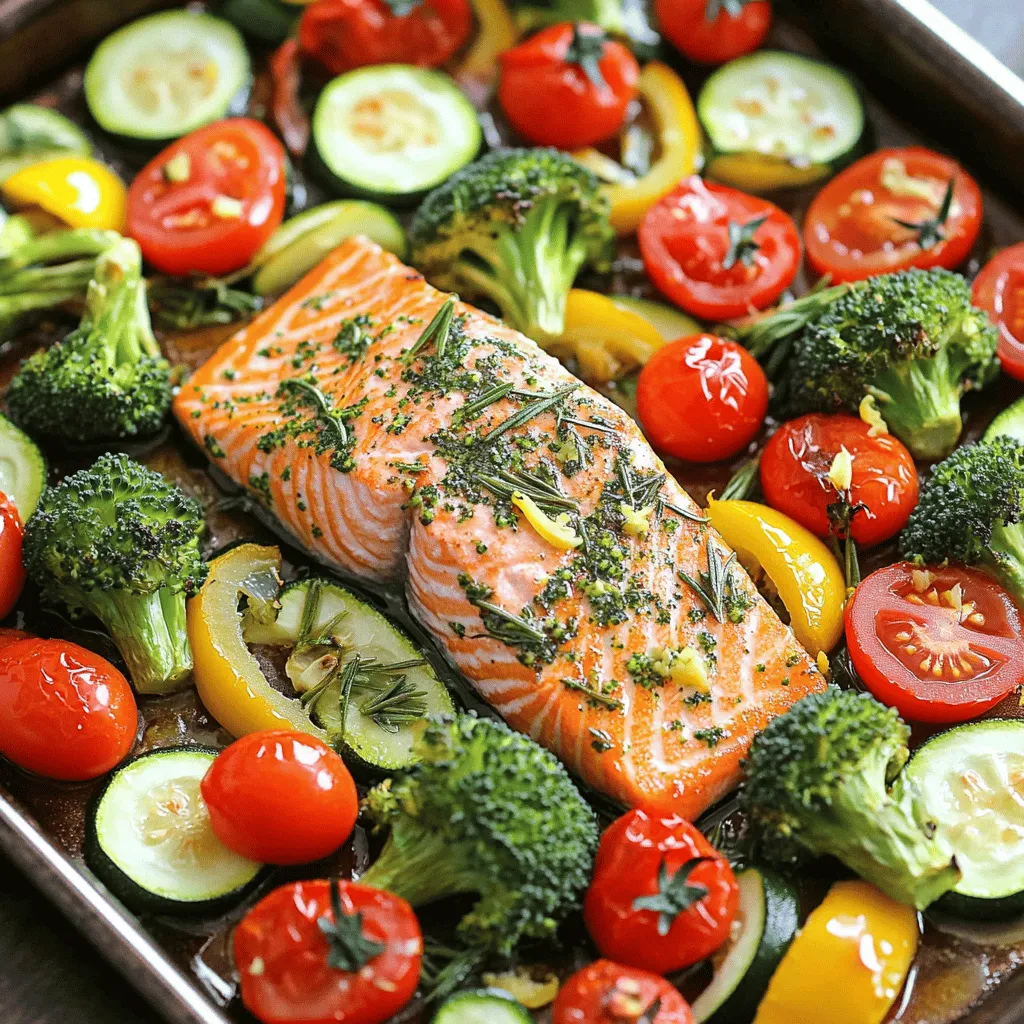 . Enjoy cooking this easy and healthy meal! 1. Preheat the oven and prepare the baking tray Set your oven to 400°F (200°C). This high heat helps cook the salmon and veggies quickly. Line your baking tray with parchment paper for easy cleanup. 2. Create the herb marinade In a small bowl, mix together 4 cloves of minced garlic, 3 tablespoons of olive oil, the zest and juice of 1 lemon, 1 tablespoon of fresh chopped rosemary, and 1 tablespoon of fresh chopped thyme. This blend packs a lot of flavor. 3. Arrange salmon and vegetables on the sheet pan On your prepared baking tray, place 4 salmon fillets in the center. Surround the salmon with 2 cups of halved cherry tomatoes, 1 cup of broccoli florets, 1 cup of sliced zucchini, and 1 sliced red bell pepper. This mix creates a colorful and tasty meal. 1. Drizzle marinade and season Pour the herb marinade over the salmon and veggies. Make sure everything gets a nice coat. Then, season with salt and pepper to your liking. 2. Baking time and temperature Bake your sheet pan meal in the preheated oven for 15-20 minutes. This time allows the salmon to cook through and the veggies to become tender. 3. Checking for doneness and serving To check if the salmon is done, use a fork. It should flake easily. Once cooked, remove the tray from the oven. Let it rest for a few minutes before serving. Enjoy this delightful dish directly from the pan, or plate it up for a fancy touch. For extra brightness, serve with a lemon wedge on the side. For the full recipe, see the detailed instructions above. To achieve the perfect salmon texture, use fresh fillets. Look for bright color and firm flesh. When cooking, don’t overbake. Salmon should flake easily but remain moist. Ensure your vegetables cook evenly by cutting them into similar sizes. This helps them roast at the same rate. For a nice char, place denser veggies like broccoli and bell pepper further from the heat source. Serve this dish directly from the sheet pan for a cozy, rustic look. For a more polished presentation, transfer the salmon and veggies to individual plates. Add a lemon wedge on the side to brighten the dish. To elevate flavor and aesthetics, sprinkle chopped herbs like parsley or dill on top. A drizzle of balsamic glaze can also add a touch of sweetness and shine. For the full recipe, refer to the earlier sections. {{image_2}} You can mix and match different vegetables in this dish. Seasonal veggies work well. Try asparagus in spring or butternut squash in fall. Other great options include: - Carrots, sliced - Green beans - Cauliflower florets Adjusting cook time is key for different veggies. Softer vegetables, like zucchini, may need less time. Harder ones, like carrots, may need a bit more. Keep an eye on them as they cook. Aim for tender but not mushy. Changing the herbs can give this dish new flavors. If you love dill, use it instead of rosemary. Basil also adds a nice touch. Here are some ideas: - Oregano for a Mediterranean twist - Cilantro for a fresh bite You can create different marinades too. Mix olive oil with lemon juice and your herb of choice. Experiment with spices like paprika or cumin to add more depth. The options are endless! To keep your Garlic Herb Salmon & Veggies fresh, follow these steps. First, let the dish cool to room temperature. This helps avoid condensation in storage. Then, place the leftovers in airtight containers. Glass containers work well, as do BPA-free plastic ones. Label each container with the date. This helps you track freshness. Store the salmon and veggies in the fridge for up to three days. If you want to keep them longer, freeze them. For freezing, use freezer-safe bags or containers. Remove as much air as possible to prevent freezer burn. You can store them for up to three months in the freezer. When it's time to enjoy your leftovers, reheating is key. For best results, use an oven. Preheat it to 350°F (175°C). Place the salmon and veggies on a baking sheet. Cover them loosely with foil. This helps keep moisture in while they warm up. Heat for about 10-15 minutes or until warmed through. You can also use the microwave. Place the food in a microwave-safe dish. Cover it with a lid or a damp paper towel to keep moisture. Heat in short bursts of 30 seconds, stirring in between. Make sure the salmon reaches an internal temperature of 145°F (63°C) for food safety. Enjoy your meal without worry! Can I use frozen salmon? Yes, you can use frozen salmon. Just thaw it in the fridge overnight. If you are short on time, you can also run it under cold water for quicker thawing. After thawing, pat it dry before cooking for the best results. This helps the salmon cook evenly. How to know when the salmon is cooked? The salmon is cooked when it flakes easily with a fork. You can also check the internal temperature. It should reach 145°F (63°C). If you do not have a thermometer, look for a bright pink color that lightens as it cooks. What sides pair well with this dish? This dish pairs well with many sides. Try serving it with a fresh green salad, rice, or quinoa. You can also add a light sauce or a squeeze of lemon for extra flavor. These sides complement the salmon and veggies nicely. How to make this recipe with less oil? To use less oil, look for a light spray or brush it on the salmon and veggies. You can also substitute oil with a splash of broth or lemon juice. This will keep the meal fresh while reducing fat. Tips for making a larger batch for meal prep? To make a larger batch, simply double the ingredients. Use a larger sheet pan or two pans if needed. Just make sure to space out the salmon and veggies. This ensures even cooking. You can store leftovers in airtight containers for easy meals later. This blog post explored making a delicious salmon and vegetable dish. You learned about the key ingredients like salmon fillets, fresh veggies, and different herbs. I provided simple steps to prepare, cook, and serve the meal, along with tips for texture a