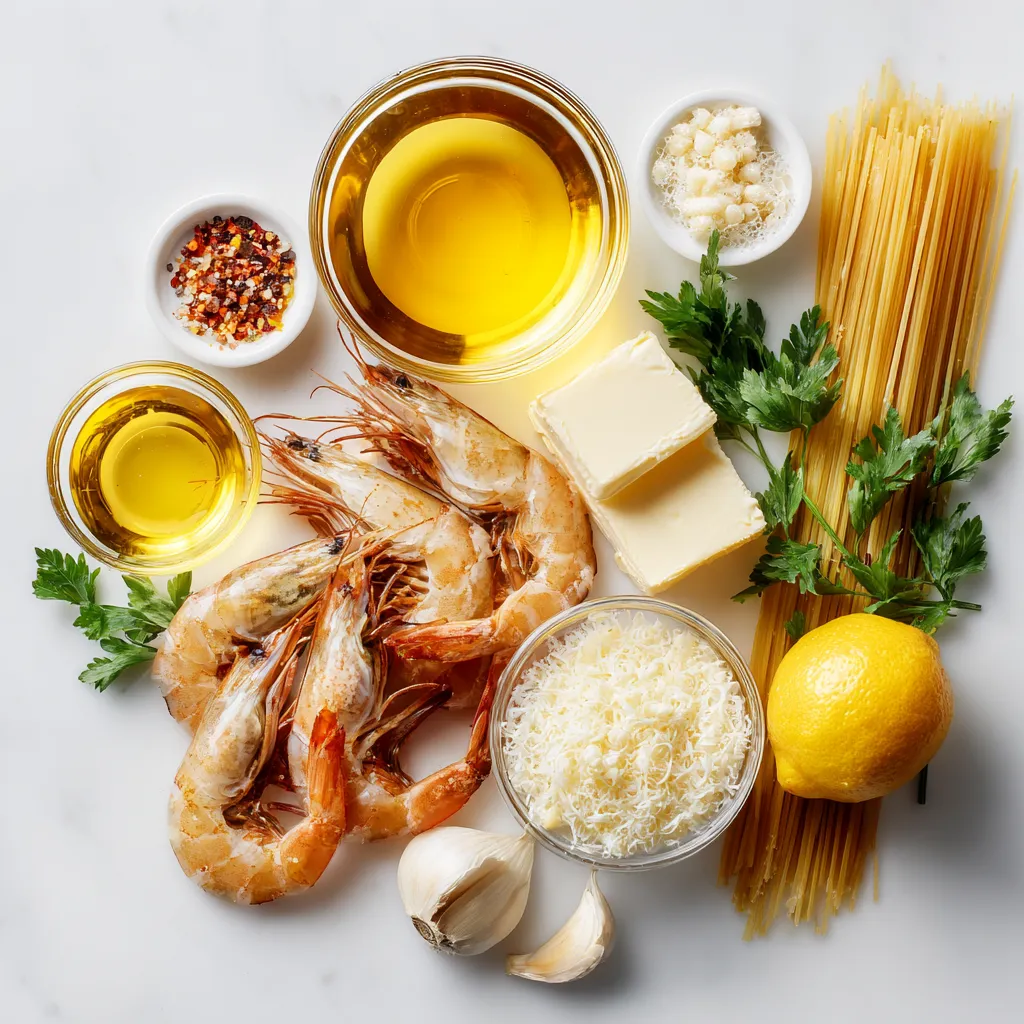 Gathering the right ingredients is key for great flavor. The shrimp gives the dish its main protein. I use large shrimp, peeled and deveined for easy eating. Olive oil and butter blend well for cooking, adding richness to the dish. Garlic brings a punch of flavor, and I use six cloves for a strong taste.
