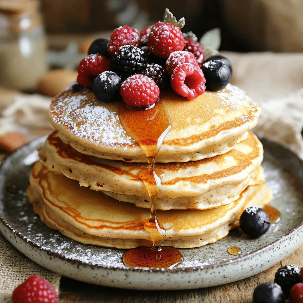 These ingredients create a simple yet tasty pancake. Almond flour is the star. It gives a nutty flavor and a soft texture. Coconut flour adds a bit of sweetness and helps absorb moisture. You can choose sugar or maple syrup for sweetness. Baking powder makes the pancakes fluffy, while salt enhances the taste.