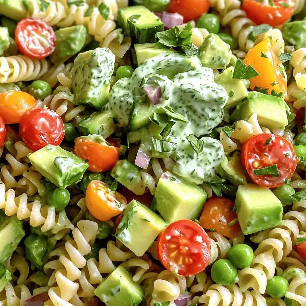 Green Goddess Pasta Salad is a fresh and vibrant dish. Each ingredient adds flavor and color. Whole grain pasta forms the base and gives a hearty touch. I love using fusilli or penne for their shape. They hold the dressing and pair well with veggies.