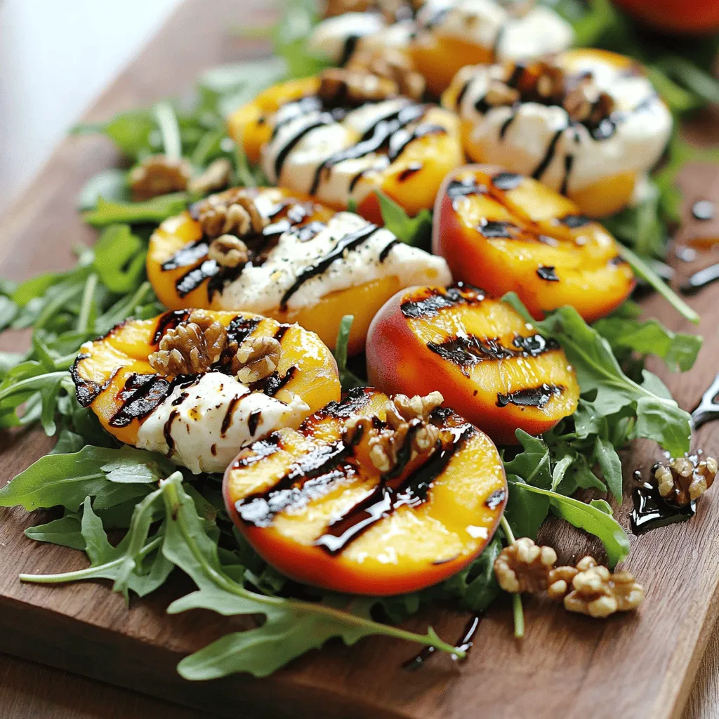 In a large bowl, place your arugula or mixed greens as the base. Slice the grilled peaches and arrange them over the greens. Tear the burrata cheese into pieces and spread it on top. Drizzle balsamic glaze over the salad to add sweetness. Finally, sprinkle toasted walnuts or pecans for crunch. Add fresh basil leaves for a lovely touch. Enjoy this fresh salad with a rustic wooden board for a beautiful look.