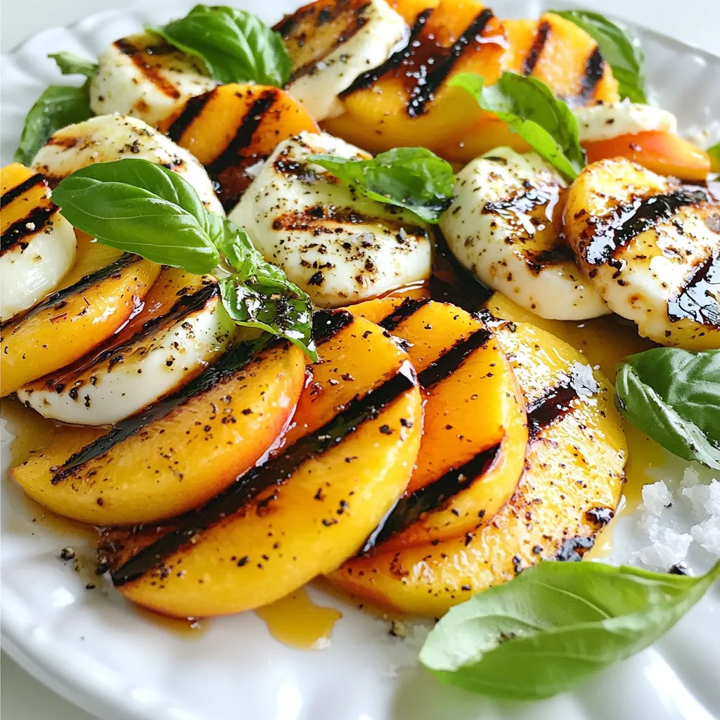 A refreshing salad featuring grilled peaches, fresh mozzarella, and basil, drizzled with balsamic glaze.