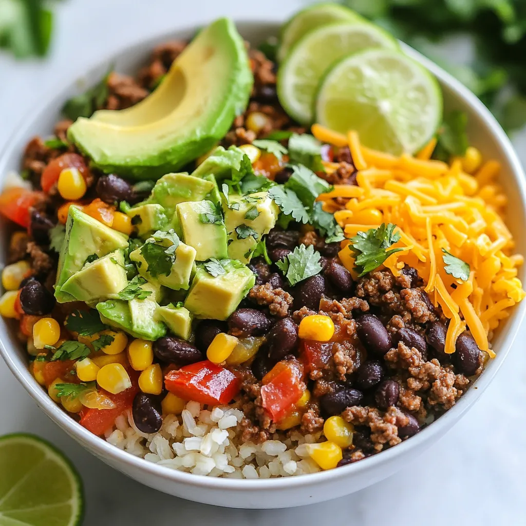 A delicious and hearty burrito bowl featuring seasoned ground beef, brown rice, and fresh toppings.